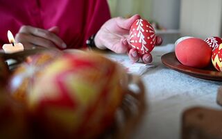 Наталья Морозкина предложила нам комбинированный, более увлекательный вариант тычковой росписи: в нём используются расплавленный воск, как в традиционных писанках, и обычная деревянная палочка. Инструмент обмакивают в воск и делают аккуратные "тычки" по поверхности яйца, формируя рельефный и фактурный рисунок. Такой метод позволяет создавать объёмные узоры, похожие на вышитые, и они выглядят очень нарядно и самобытно.