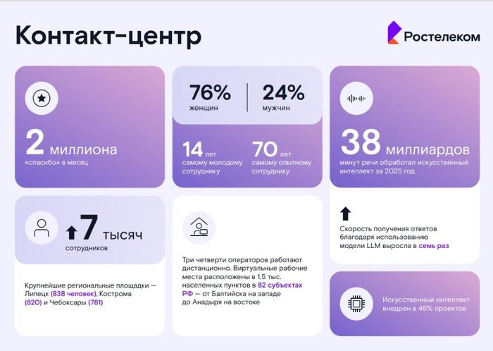 В 2025 году "Ростелеком Контакт-центру" исполняется 30 лет. Сегодня компания входит в топ-3 крупнейших аутсорсинговых контакт-центров России, постоянно внедряет инновационные решения для работы с клиентами, в том числе на базе ИИ и больших данных.