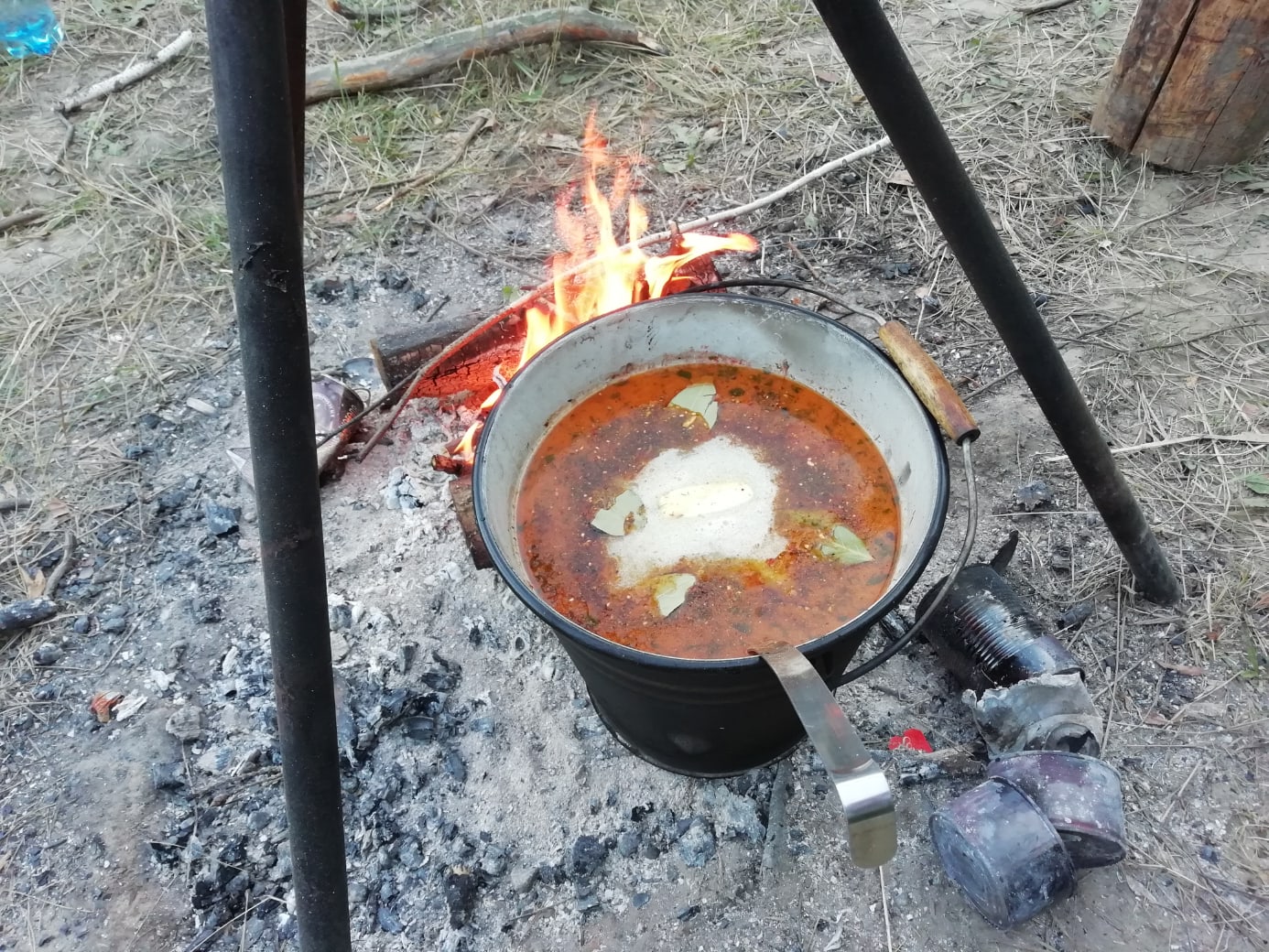 Костёр для обеда решено развести на правом берегу Тары, вблизи смотровой площадки, расположенной на высоком берегу. С неё хорошо просматриваются окрестности на несколько километров. Проголодавшихся путников ждёт уха из пойманной утром щуки и ещё нескольких рыб, выловленных по дороге. На одном из катамаранов собрались настоящие рыбаки.