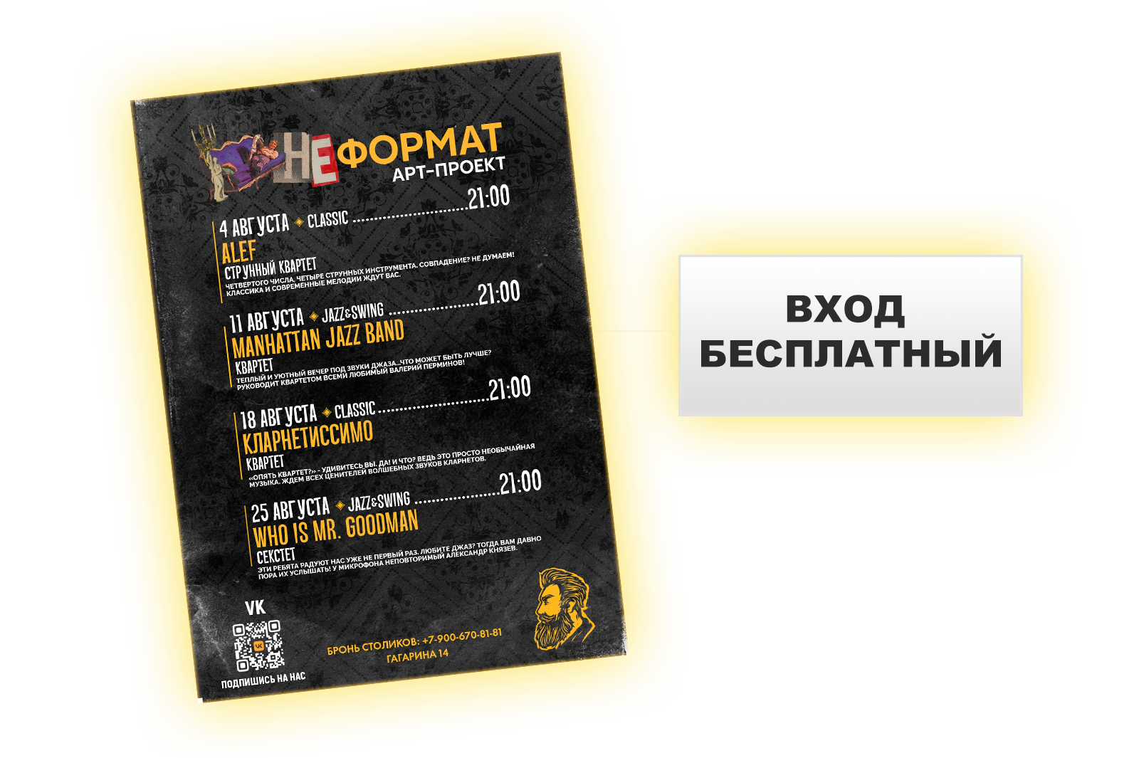 - На вечера проекта "НЕформат" мы привлекаем людей из культурной среды. Ориентируемся на женщин в основном, знаем, какого возраста, где отдыхают, какие места посещают. И главная фишка: у нас вход бесплатный и нет депозита, а это привлекает. Любой человек может зайти и без проблем сесть за столик, если он свободен. Летом мы выставляем колонку на улицу и полностью транслируем то, что происходит на сцене, и я заметил, что, когда тёплая погода, люди заходят и удивляются, им нравится.