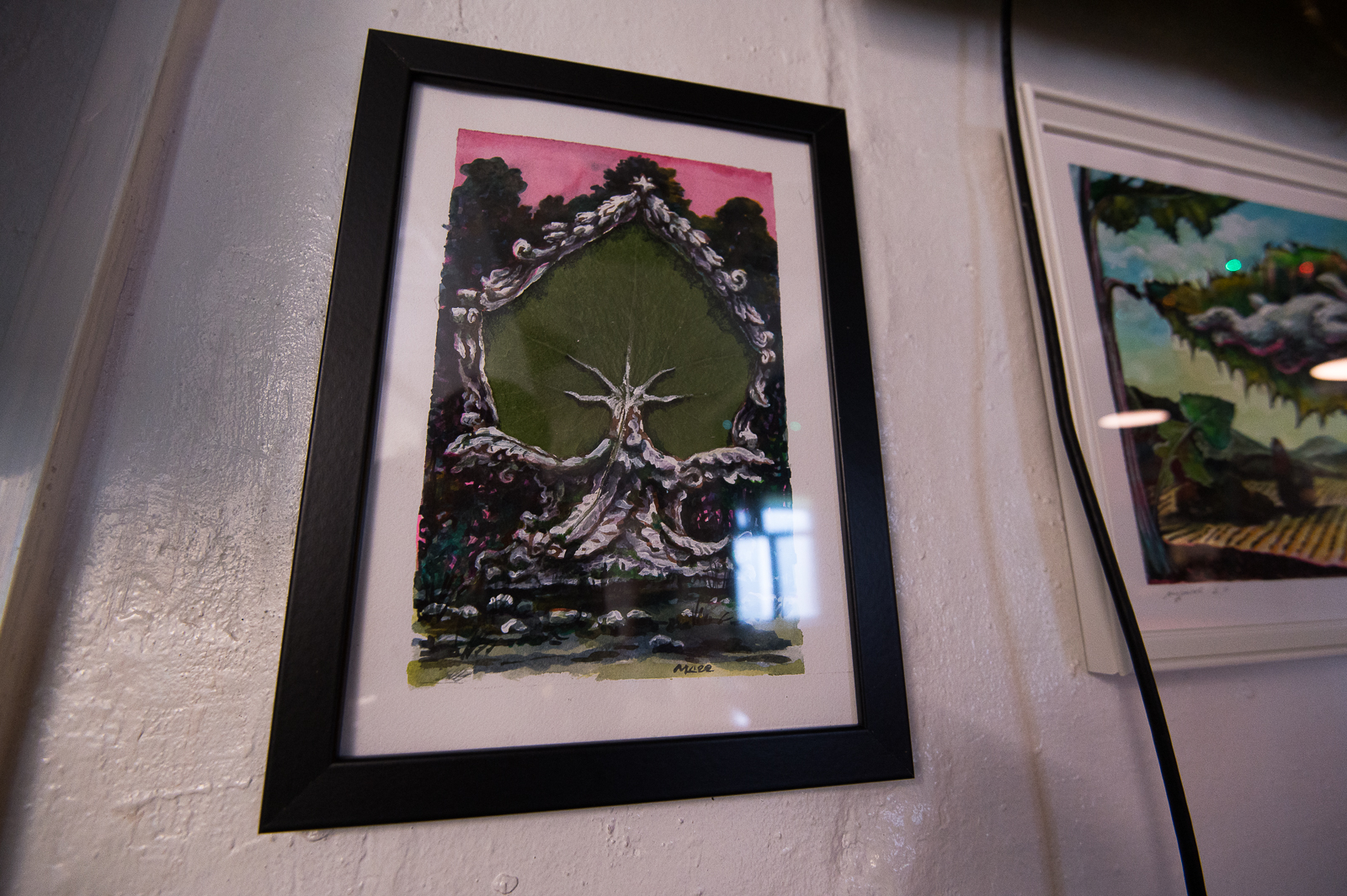 Выше всех в этой домашней экспозиции - круглая работа в черно-зелёных тонах.