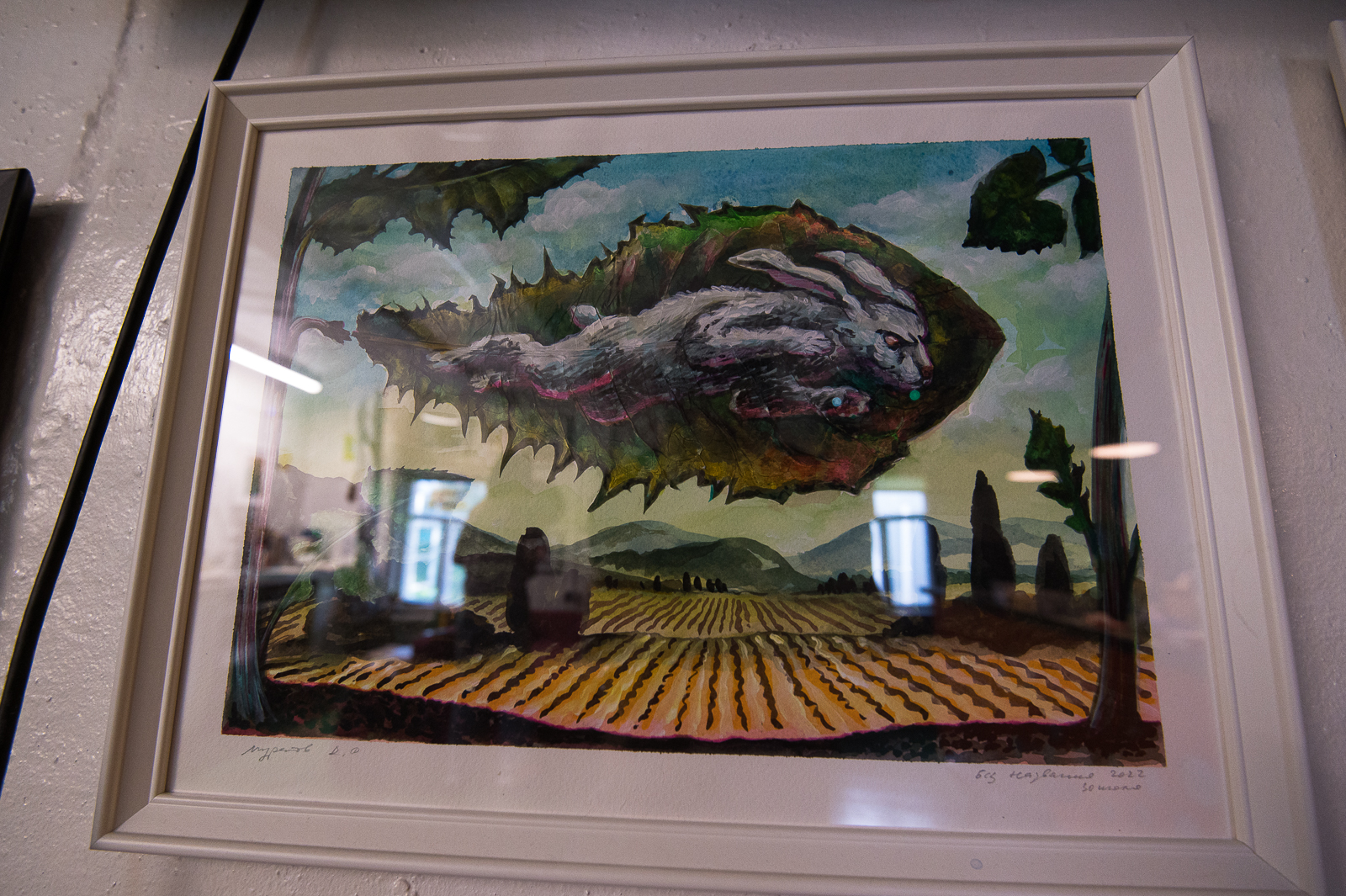 - А это просто маленький зелёный кит из листа хрена, картина посвящена моему другу из Новосибирска Сергею Беспамятных, который, к сожалению, в этом году покинул нас, подвело сердце. Сам он мастер спорта по штанге, и у него прозвище было "Кит". Он был достаточно мускулистый и сам очень любил рисовать китов. Поэтому эта работа выполнена в память о нём.