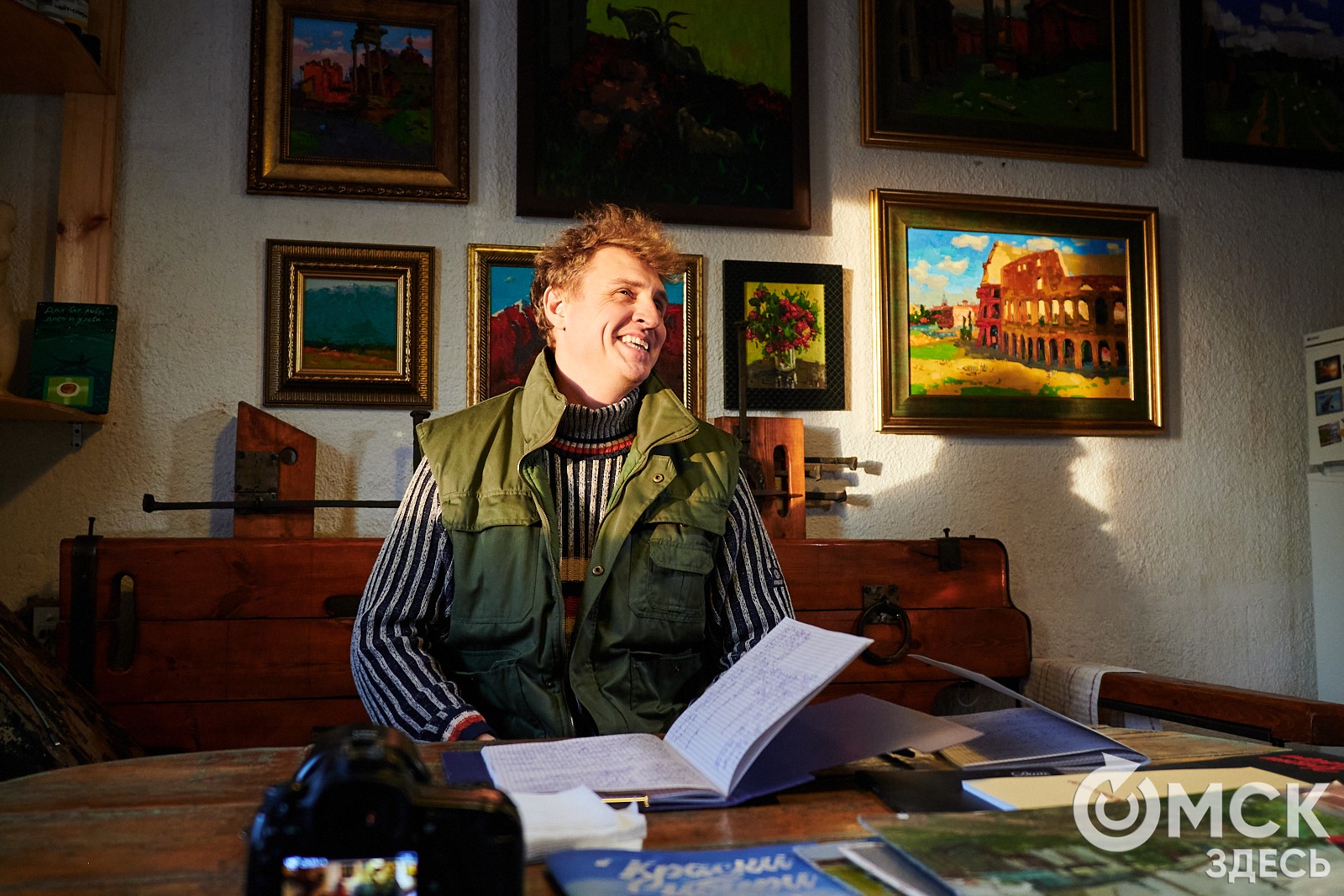 Выпускник омского худграфа не раз бывал в творческих поездках, на международных пленэрах, выставлялся персонально и в рамках конкурсов. Результаты "художественных изысканий" обычно сосредоточены в галерее-мастерской на Ленина, 46, куда можно попасть с экскурсией. В минувшем январе впервые состоялся день открытых дверей, и "Омск Здесь" подсмотрел, чем живёт художник.