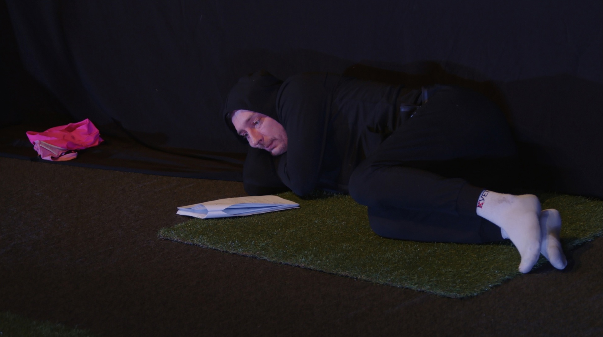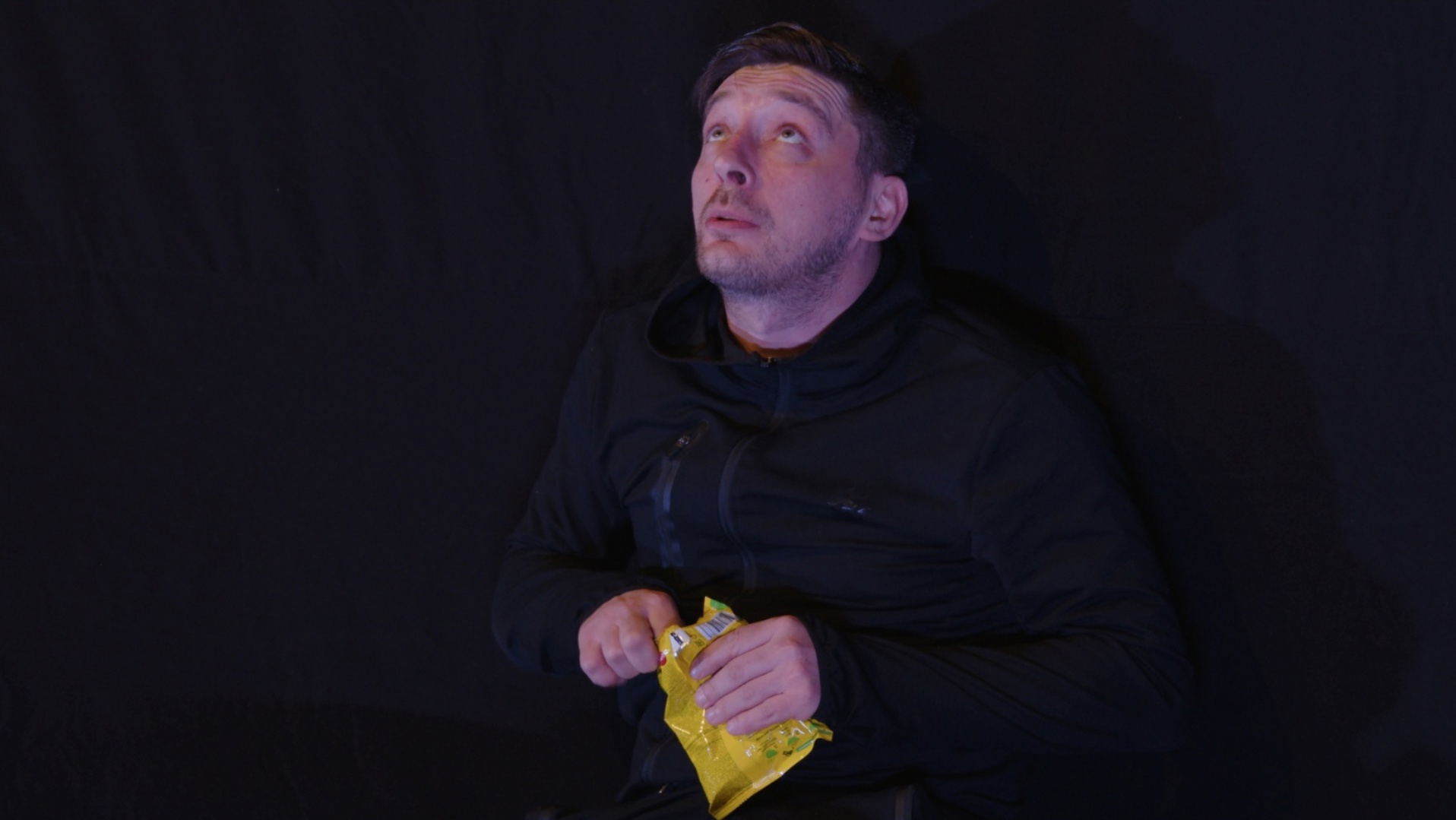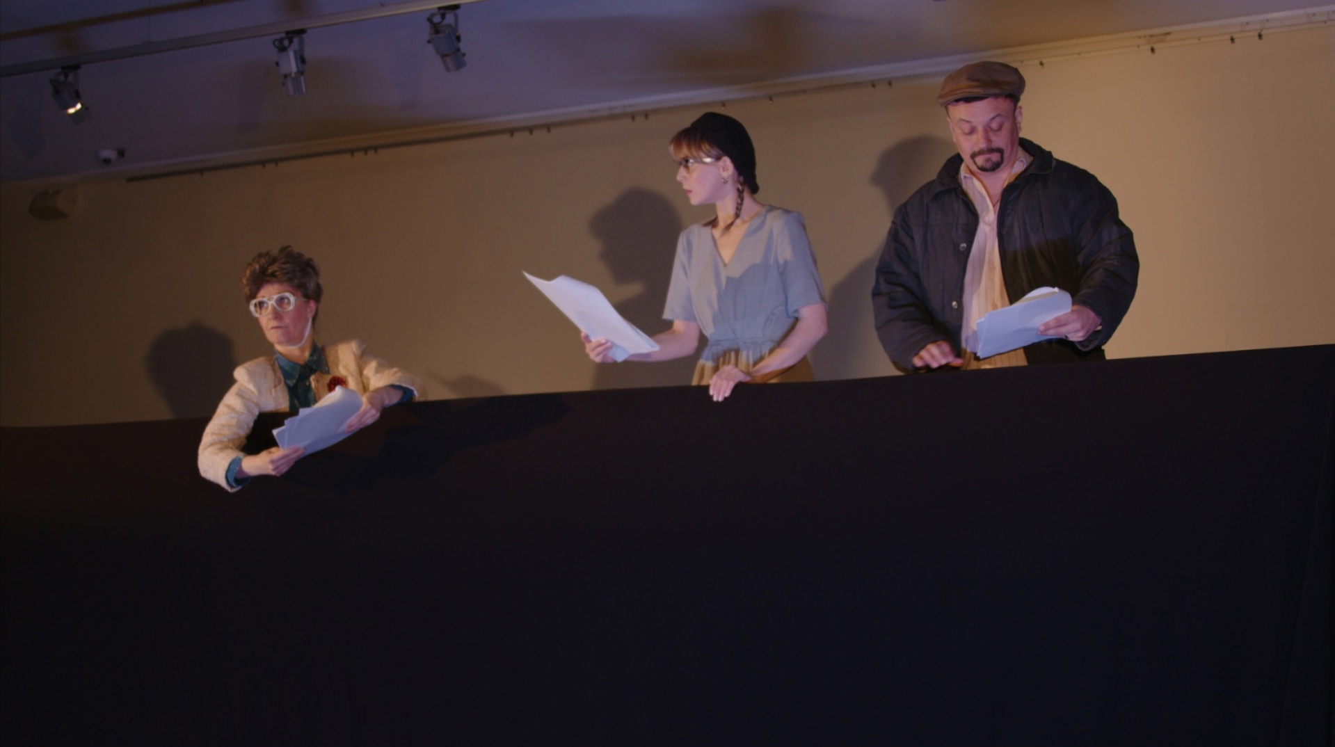 Декорации к читке схематичные: пара ёлок и чёрная ширма, обозначающая край канавы. С неё на Виктора Груза, разлёгшегося на дне, неодобрительно взирают случайные и не случайные для главного героя люди. И всем от него что-то нужно.