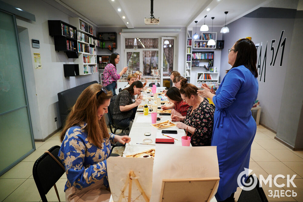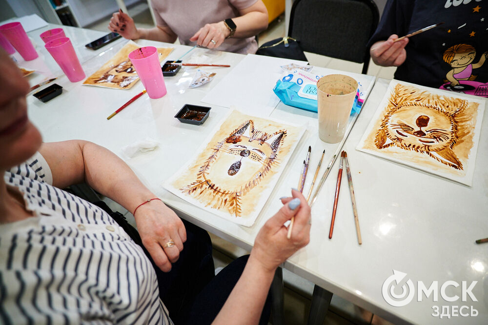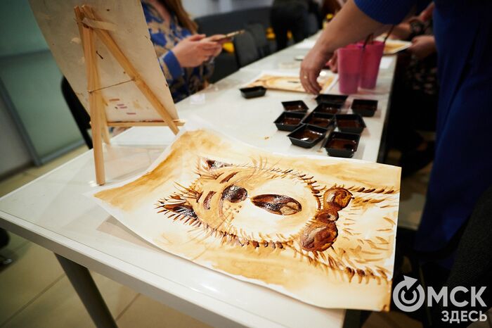 В библиотеке также прошёл творческий мастер-класс по рисованию кофе - это одна из техник изобразительного искусства, в которой раствором из душистых зёрен используются в качестве краски. Участники создали зевающих пушистых котов. Занятие провела художник Анна Седанова.