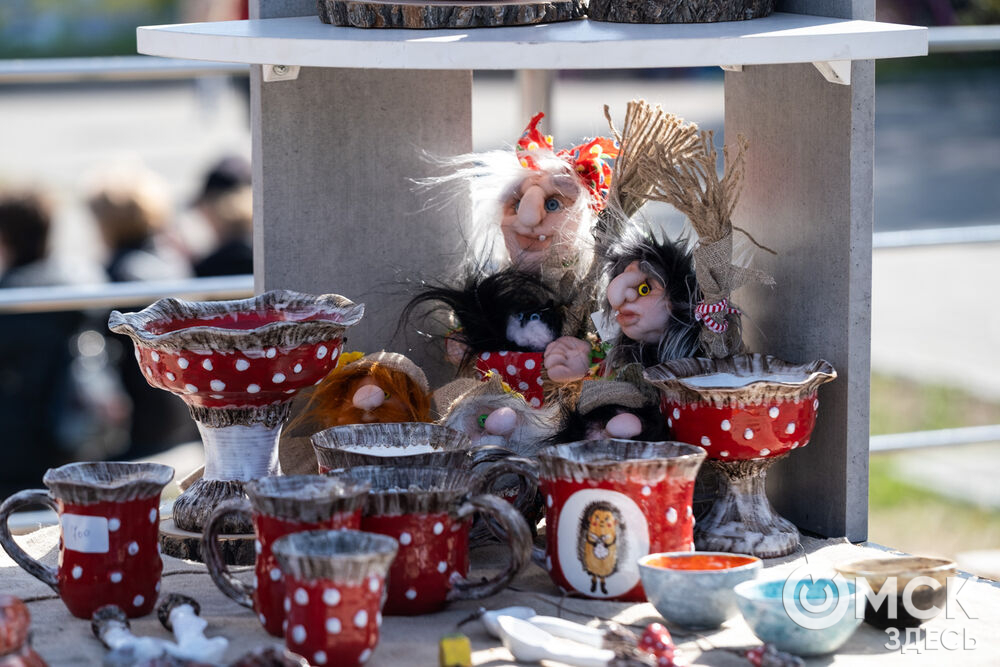 Советский парк привлекал ярмаркой мастеров. Тут были и кружки ручной работы с кошачьими мордочками, и плетёные из лозы корзины, и чашечки-мухоморчики, и в целом глаза разбегались от разнообразия ручной работы.