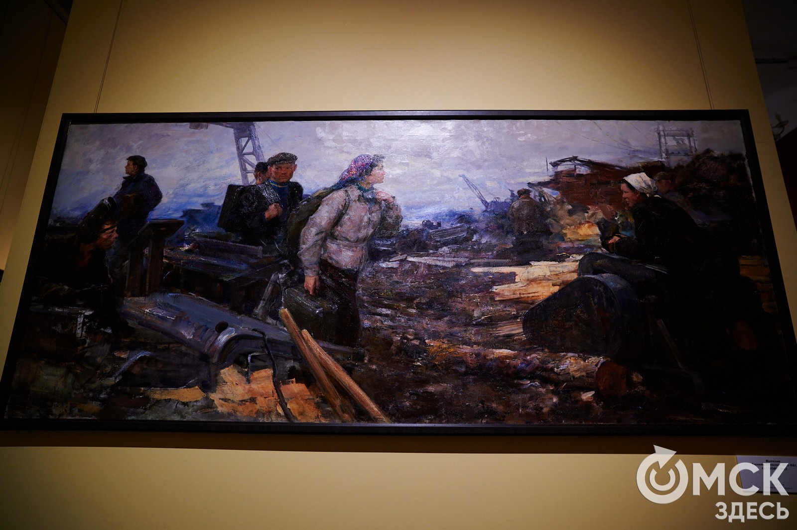 Дух новой эпохи и возвышенный образ советского человека олицетворяет заглавная композиция выставки - работа советского мастера Александра Дейнеки "Стахановцы".