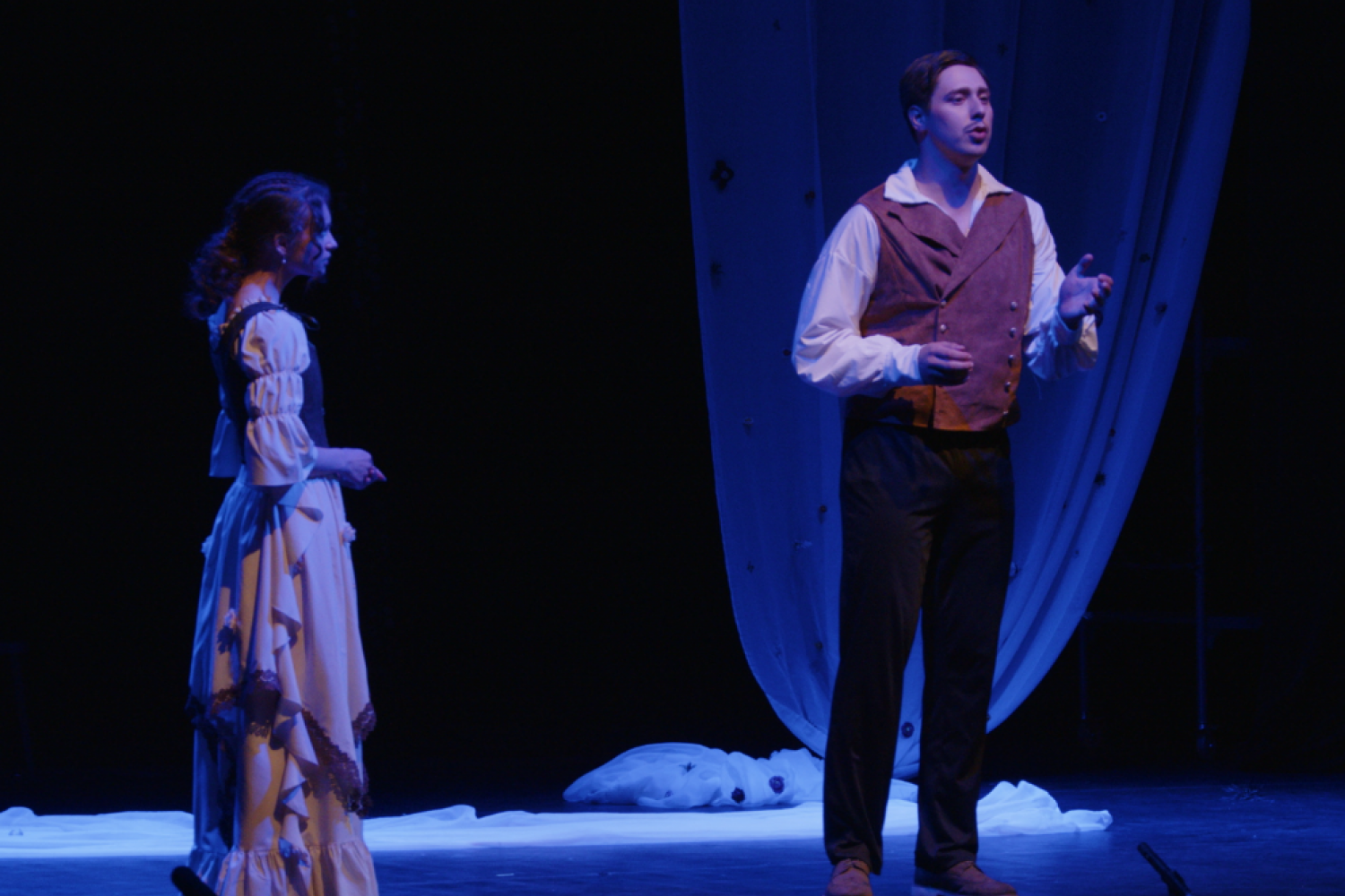 "Быть человеком или быть поэтом" - таким выбором терзается юный Мишель Лермонтов по фабуле премьерной постановки экспериментального театра "Комната 24". И, кажется, не может разорваться и выбирает застыть где-то посередине. Ведомый музой, но погружённый в омут человеческих страстей. Баловень судьбы, инфантил, фаталист, величавый и мощный, как Кавказский хребет: все издали видят вершины, но почти никто не всматривается в зияющие пропасти. Возможно, только она - неслучившаяся возлюбленная Варвара Лопухина (в чувственном и нежном исполнении Насти Мирошниченко) полностью понимает и принимает его. Но юный поэт, похоже, не обнаруживает в себе и крупицы той мудрости и глубины, которыми щедро осыпана его поэзия.