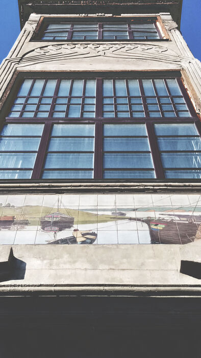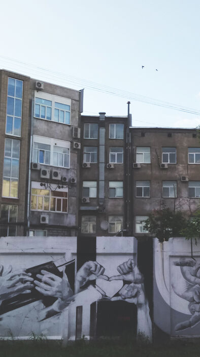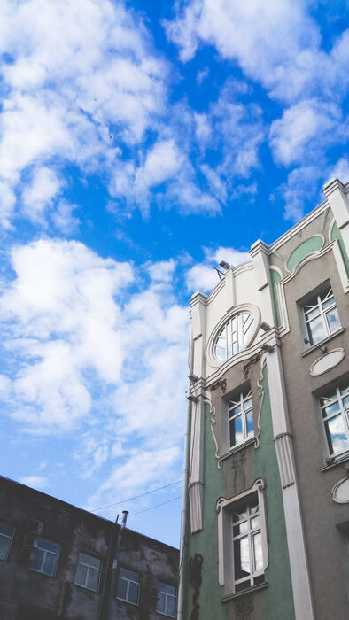 Через дорогу от столетнего дома Печокас, прекрасного, но тоже требующего реставрации, находится лабиринт из безымянных проездов и зданий: автомойки, бизнес-центр с аллюзией на тот же модерн, дворики жилых домов. Здесь же есть граффити, в которых языком жестов зашифрована строчка Цоя "Перемен требуют наши сердца. Перемен требуют наши глаза". И всё это в паре сотен шагов от "Маяковского".
