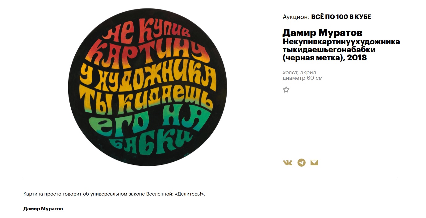 - Делаем мир российского современного искусства ближе, - говорится в описании аукциона, у которого есть и офлайн-галерея VLADEY Space на территории пространства "Винзавод". При этом в соседней галерее - 11.12 GALLERY - как раз представлены работы Дамира Муратова.