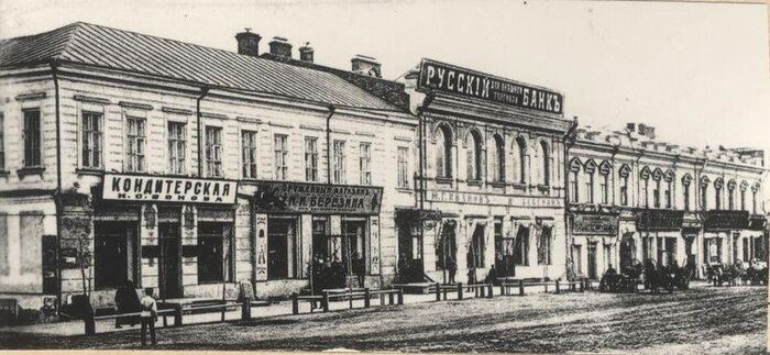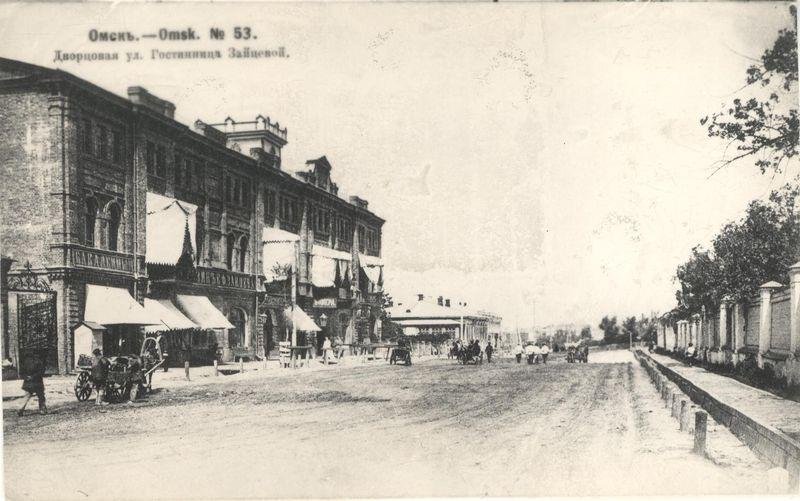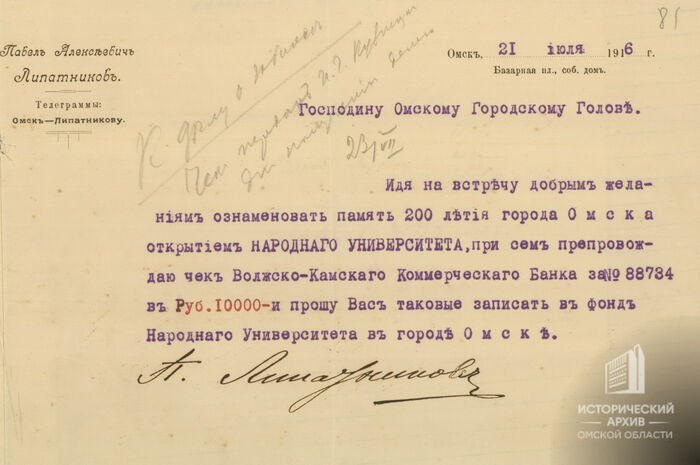 Письмо купца П.А. Липатникова о пожертвовании на Народный университет (Исторический архив Омской области); ул. Дворцовая в начале XX в. (Дрейлинг И. П. (автор копии), ОГИК музей/goskatalog.ru)