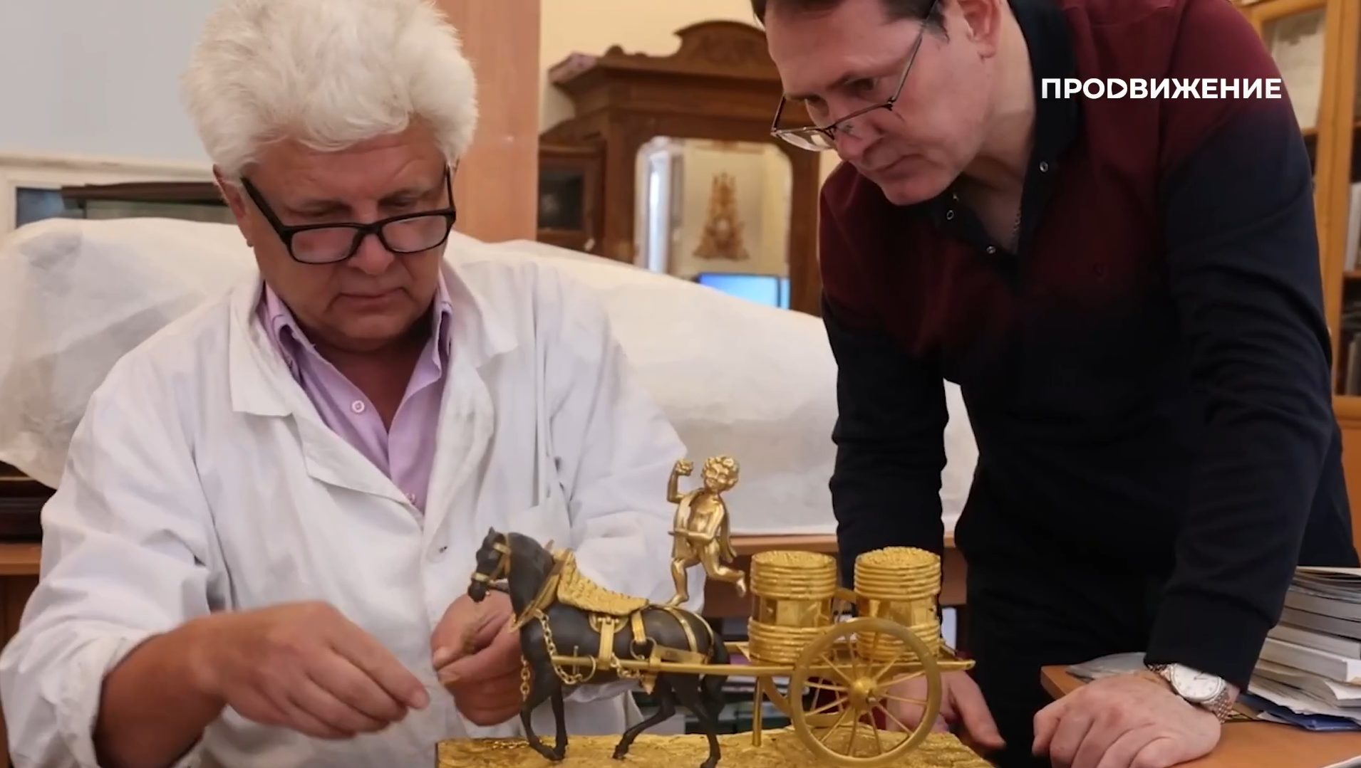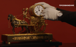 Позолоченные каминные часы первой четверти XIX века, выполненные из бронзы, поступили в фонд музея в 1925 году. Композиция на часах восходит к античному сюжету, связанному с идеей изобилия. Хронометр изготовлен в виде двухколёсной повозки, в которую запряжена лошадь. Многие детали были утрачены: отсутствовала фигурка маленького Вакха - древнеримского бога виноделия, сельского хозяйства и плодородия, он должен был управлять колесницей и везти бочки с вином. Плюс у часов не было циферблата. Три года назад началась реставрация экспоната - совместный проект музея имени М.А. Врубеля и Государственного Эрмитажа. Омские реставраторы восстановили фигурку маленького божества, ограждение телеги и бочку, на которую крепится циферблат. А петербуржцы вернули экспонату часовой механизм. Реставрационные работы велись вручную по фотографиям.