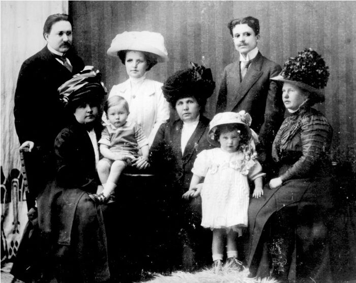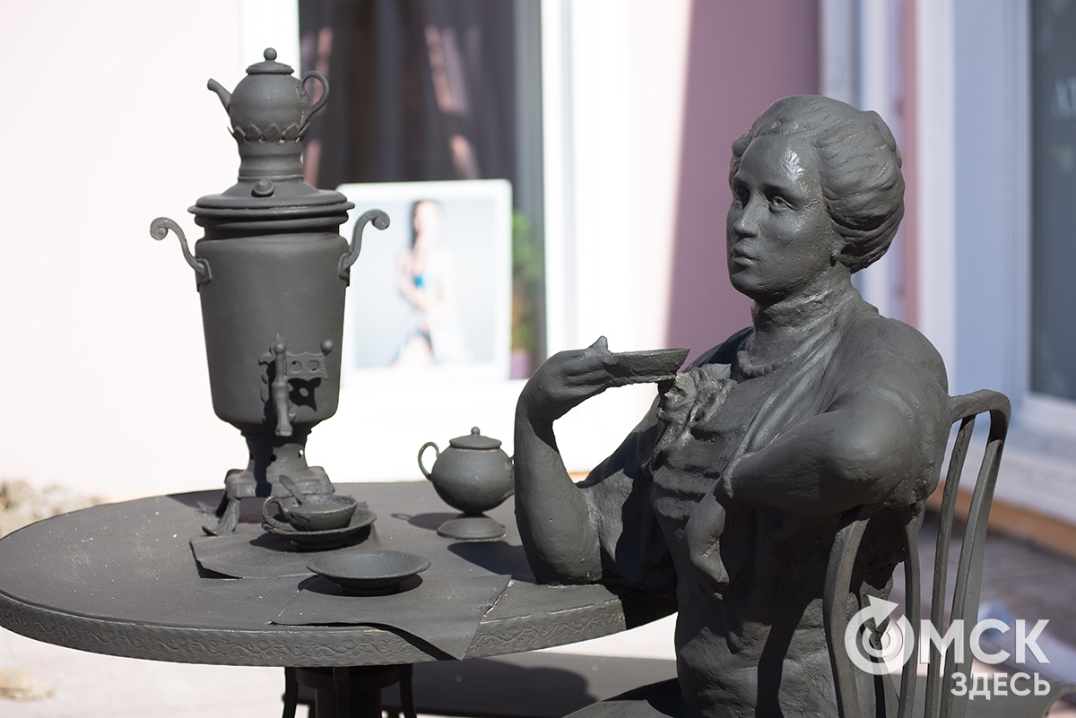 Мария Шанина с семьёй и скульптура в память о ней рядом с торговым домом. Источник: фотофонд Исторического архива Омской области, архив "Омск Здесь"