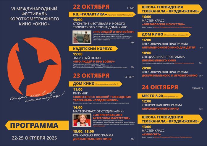 С 22 по 25 октября в нашем городе состоится VI Международный фестиваль короткометражного кино "ОКНО". Он давно стал международным событием: в этот раз в нём примут участие более 400 режиссёров из разных уголков России и 12 зарубежных стран. Все фильмы фестиваля имеют ограничения по возрасту и доступны к просмотру лицам, достигшим 16 лет.