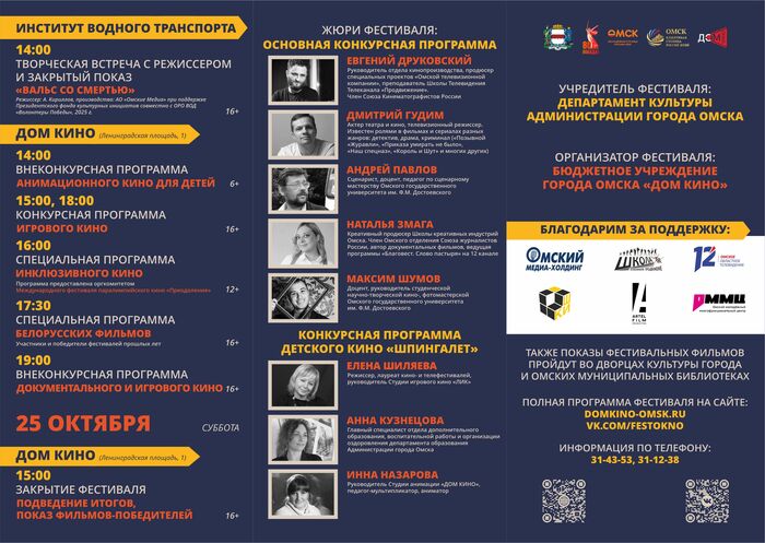 Фестиваль завершится 25 октября в 15:00. Жюри подведёт итоги, зрителям ещё раз покажут фильмы-победители и состоится презентация результатов работы Молодёжной кинолаборатории. Это часть Международного кинофестиваля "Свидание с Россией. Сибирский характер" имени Михаила Ульянова, который пошёл в Омской области в марте 2025 года.