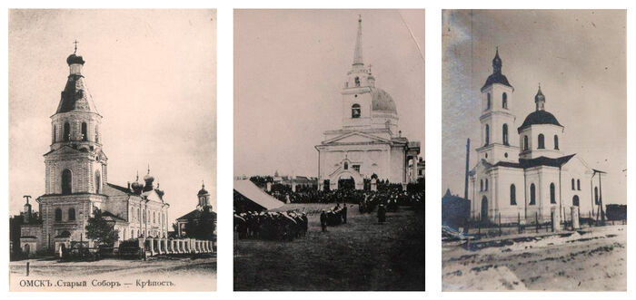 Вид на Крестовоздвиженский собор в 1919 г. (Канадский военный музей/siberianexpedition.ca); соборы Воскресенский, Никольский и Крестовоздвиженский в начале-середине XX в. (ОГИК музей/goskatalog.ru)