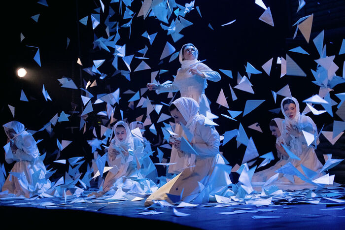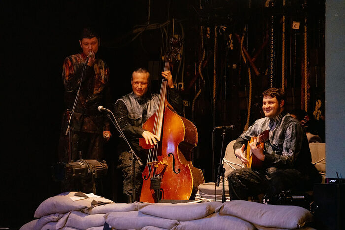 - Каждый звук в спектакле должен был идти от актёра. И получается так, что звуки печатной машинки или капающих слёз символизируют происходящую военную драму. Это тоже элемент музыки, который, возможно, даже не сразу так воспринимается зрителем, но сам по себе начинает работать на ассоциации. И момент открытия для слушателя, что в этом звуке есть ещё какое-то значение, возникает только тогда, когда этот звук живой, а не фонограмма. Именно поэтому от неё мы отказались сразу, - рассказал музыкальный руководитель постановки Андрей Пересумкин.