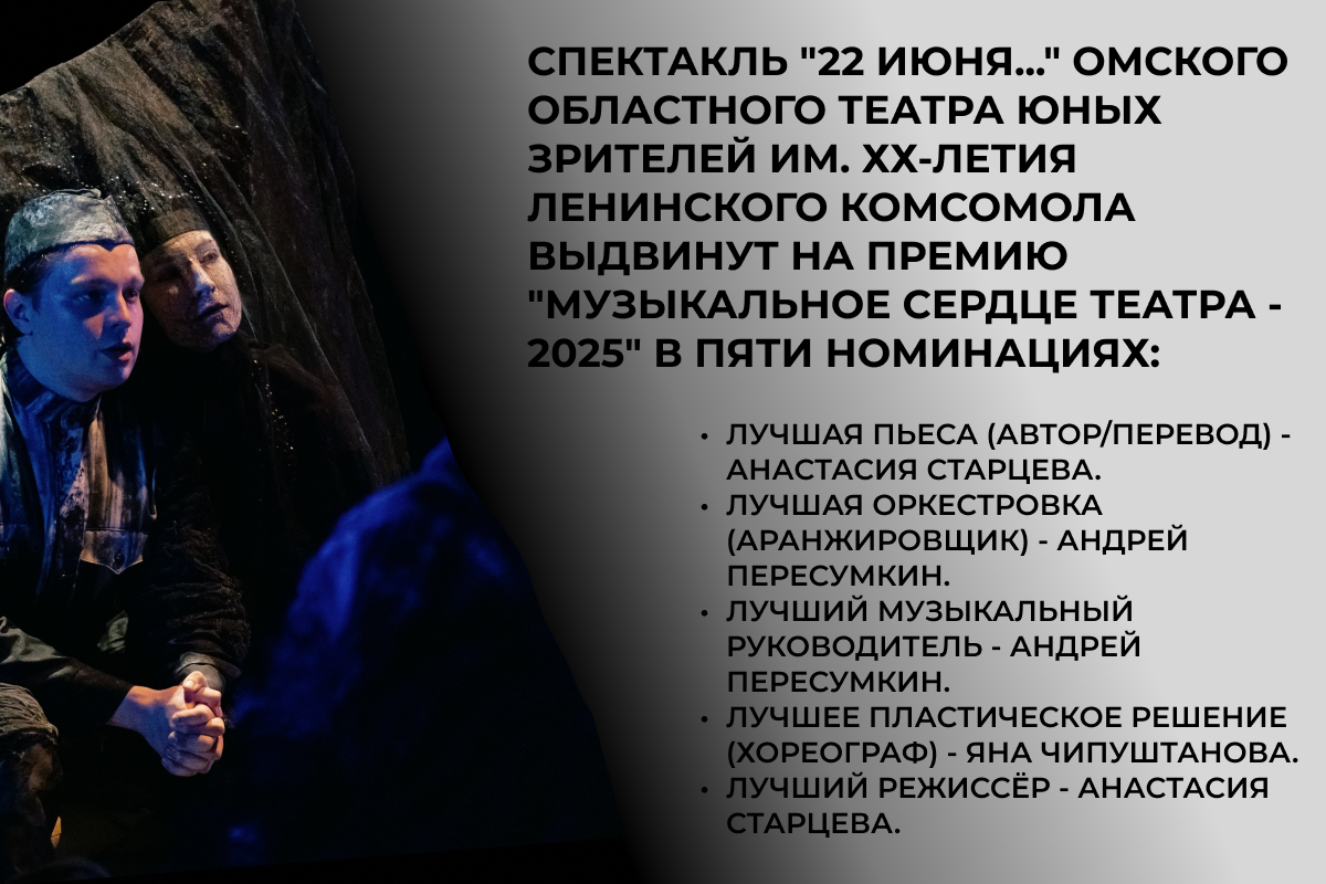 8 мая 2025 года, в преддверии 80-й годовщины Великой Победы, на сцене Омского Дома актёра состоялась премьера спектакля от Омского областного театра юных зрителей им. ХХ-летия Ленинского комсомола "22 июня…" (12+). Постановка в жанре саунд-драмы вошла в шорт-лист Национального фестиваля и премии "Музыкальное сердце театра". Фестиваль стартует сегодня в Санкт-Петербурге и продлится с 14 по 24 ноября.