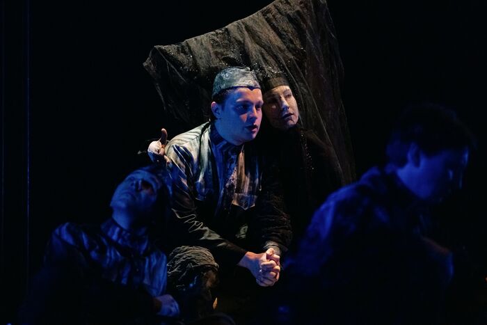 - В костюмах солдат есть фактура с ржавыми потёками, которые для меня символизируют прошедшее время. Пространство спектакля - это пограничное состояние между миром живых и миром мёртвых, а всё действие происходит на балу у Смерти. Отсюда и торжественность, которая достигается потёртыми рамками и огромными люстрами. Смерть - особый персонаж в спектакле, который символизирует быстротечность времени и важность каждой души. Сложность "22 июня…" была в том, чтобы создать впечатление о войне, а не иллюстрацию, - прокомментировал "Омск Здесь" художник Владимир Ситулин.
