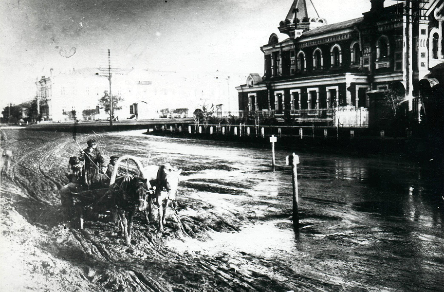 На углу улиц Тарской и Казнаковской (Ленина), 1908 г. (библиографический указатель "Мосты жизни нашей. Евгений Евсеев: исследования, публикации"/БУК "Омские муниципальные библиотеки"/lib.omsk.ru)