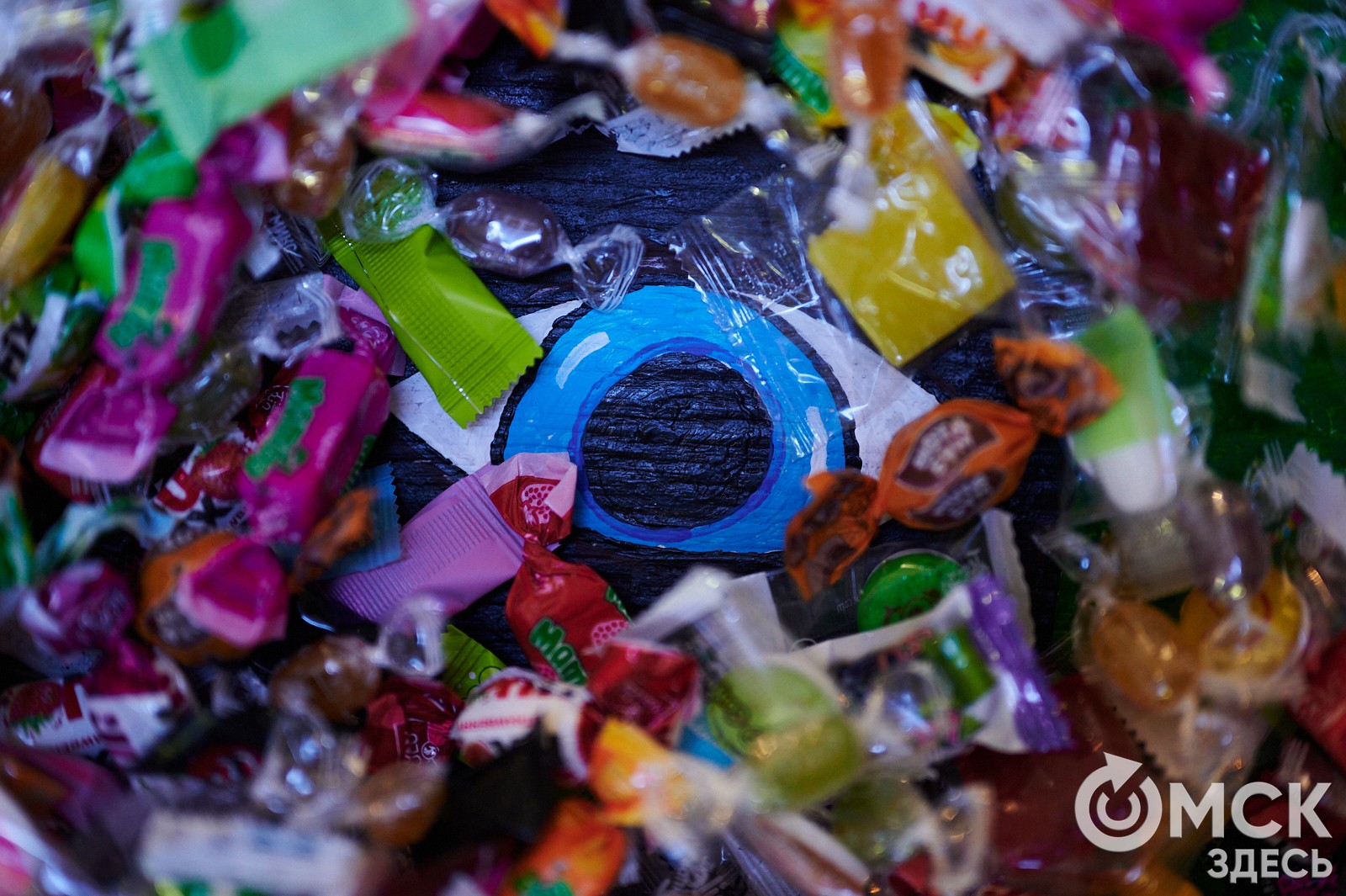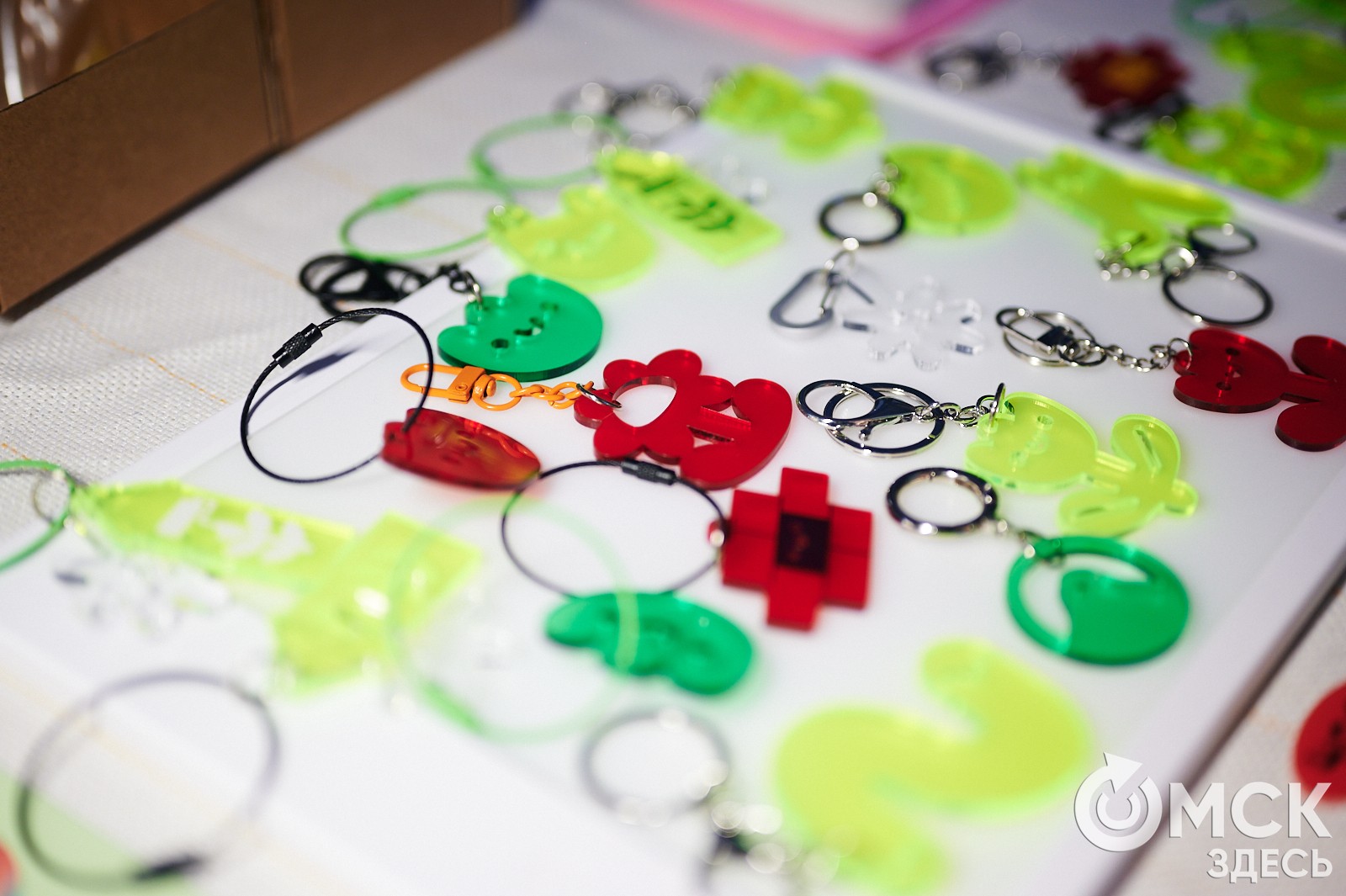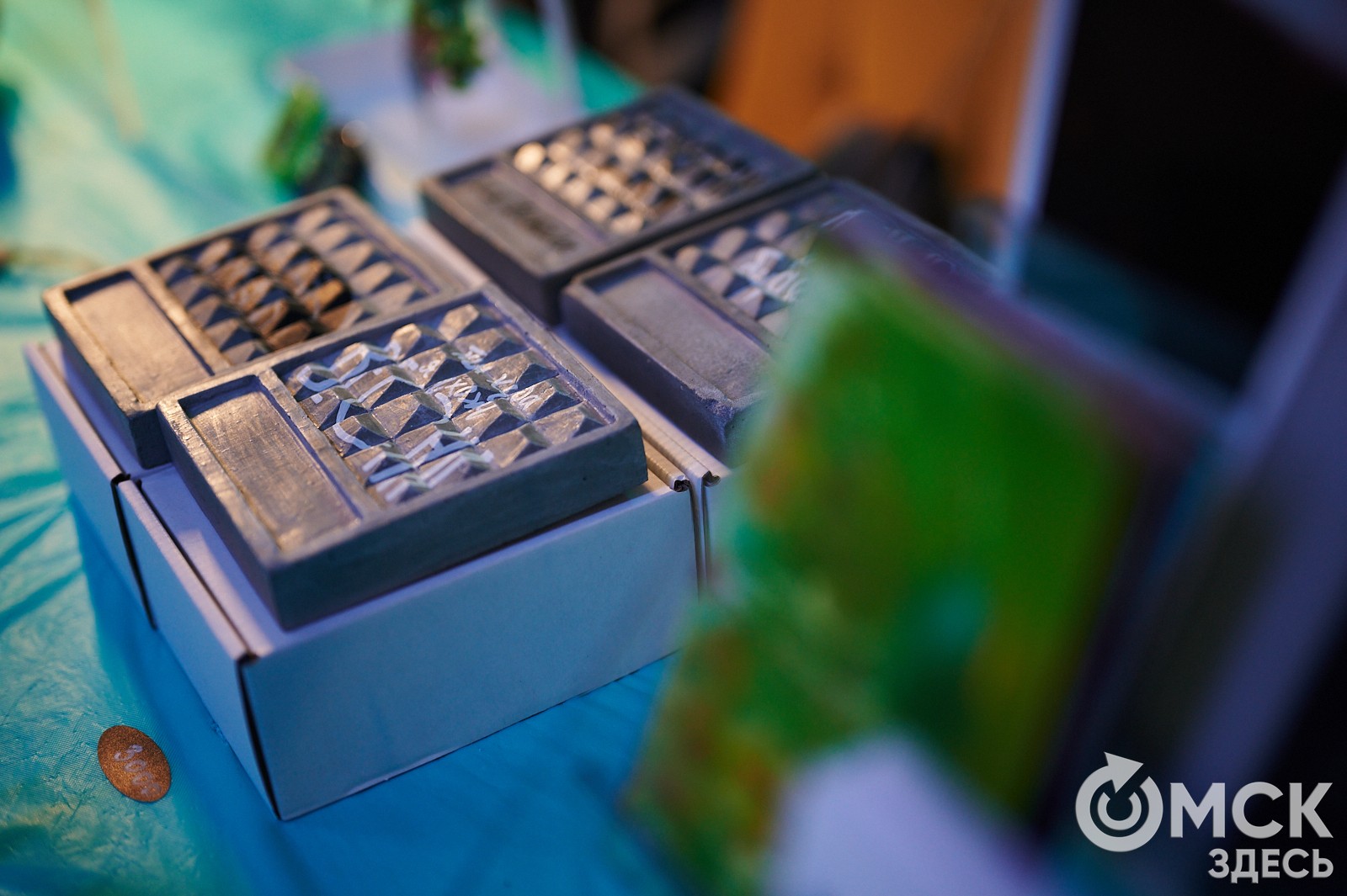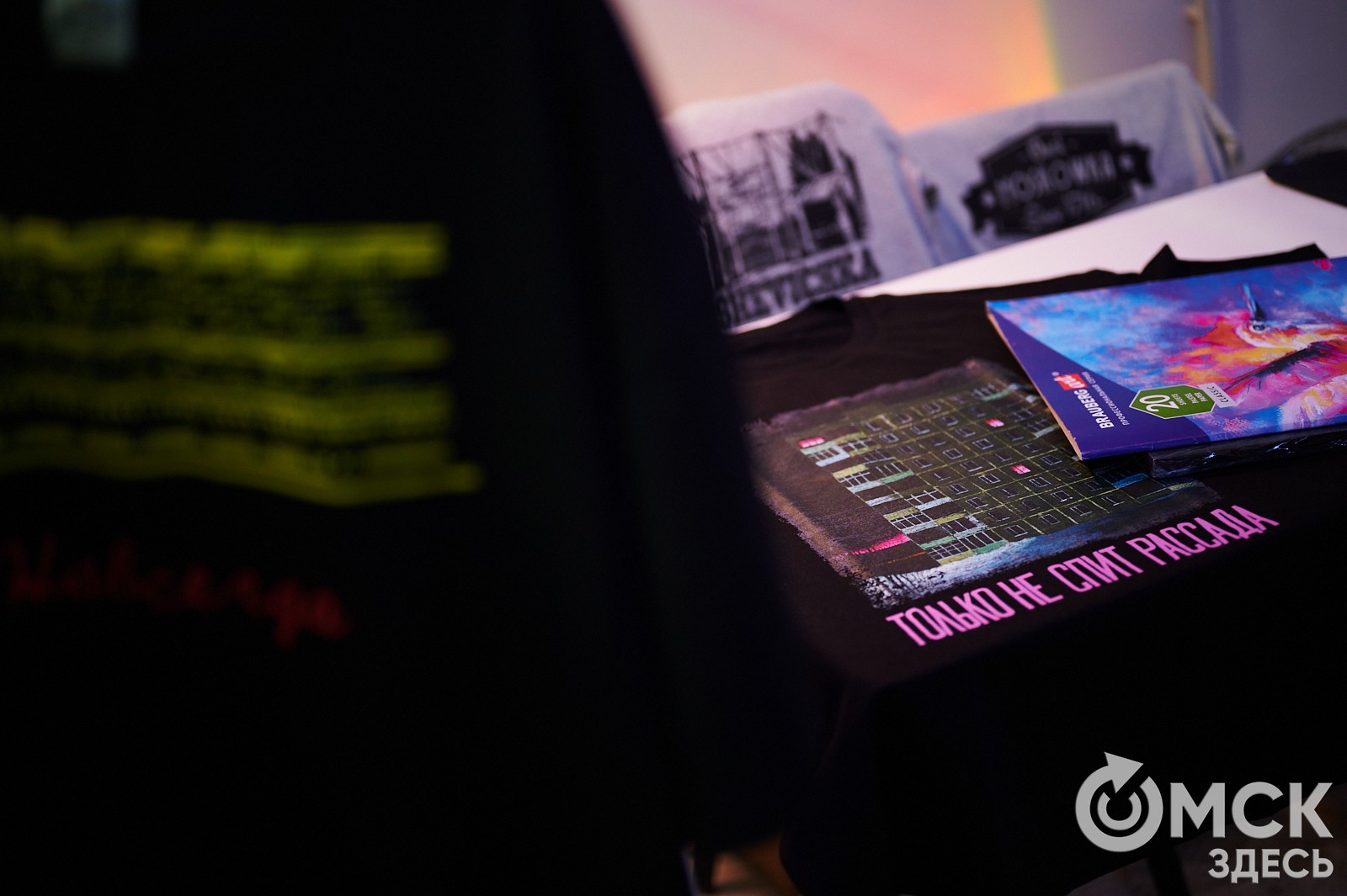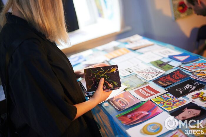 Заваленный конфетами большой стол посреди комнаты не отвлекает от главного: здесь можно найти картины и тиражную графику (авторские оттиски), брелоки и обвесы, открытки и футболки от семи творческих объединений, среди которых омские "Теплоузел", "Крепкий Палец", Bednotown, "Барак", Jvcr, "Водопад" и тарский "Сугроб", отдельных авторов, включая, например, Николая Молодцова, Ольгу Кошелеву, Елену Свешникову, Илью Це, а также работы и сувениры, создававшиеся для "Красивой выставки про Омск".