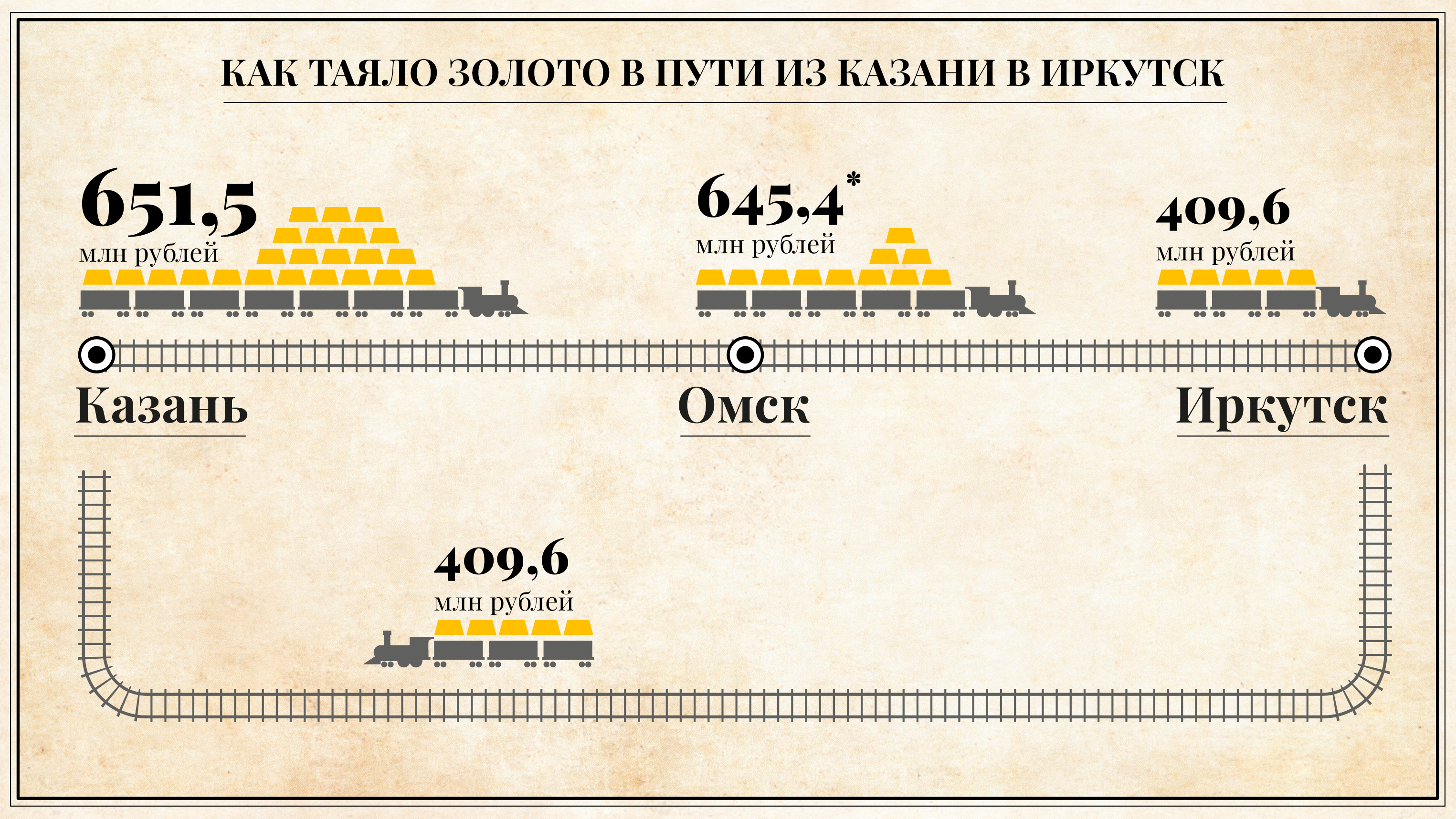 Суммы приведены в царских золотых рублях. Под звёздочкой: сумма уменьшилась, так как 100 ящиков примерно на 6 млн рублей большевики сумели эвакуировать в августе 1918 года. Инфографика: museum.cbr.ru