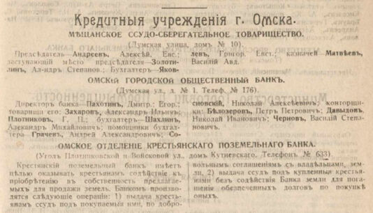 Здания Государственного банка и Казённой палаты, начало XX в.; банковские учреждения в справочнике "Весь Омск", 1913 г. Источник: ОГИК музей/goskatalog.ru; Национальная электронная библиотека/rusneb.ru