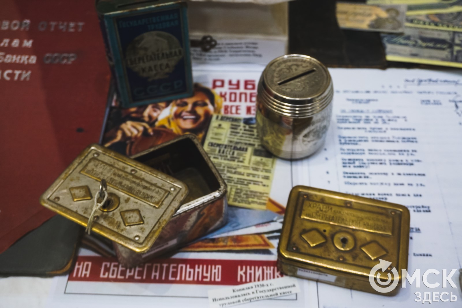 В 1920-1930-е новое советское государство развернуло кампанию по пропаганде накопления, чтобы направить средства населения на промышленность и другие цели. Так, помимо сберегательных счетов (сберкнижек), за символическую плату предлагались специальные домашние копилки, но с условием: ключ оставался в учреждении в качестве защиты от соблазна потратиться. Когда такая копилка наполнялась, её открывали и зачисляли деньги на счёт владельца. Рядом на фото - серебряная монетница начала XX века.