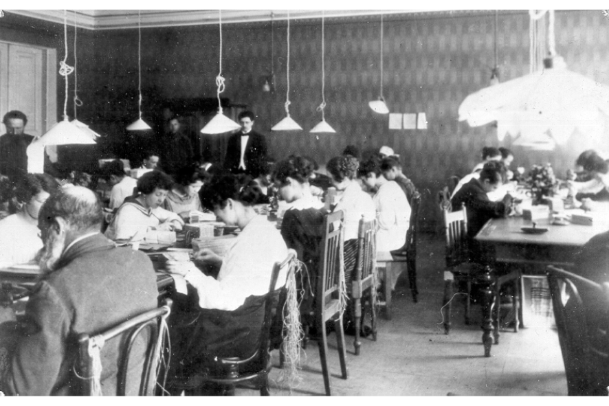 - До 1911 года Госбанк был "мужским". Причём не только по части управляющих, но и рядовых сотрудников. Позднее начали принимать родственниц служащих, не замужних, с умением печатать на машинке и знанием иностранных языков. Только в 1930-е годы женщин стали принимать на службу наравне с мужчинами, ещё через 30 лет - доверять руководящие должности, - рассказала наш экскурсовод.