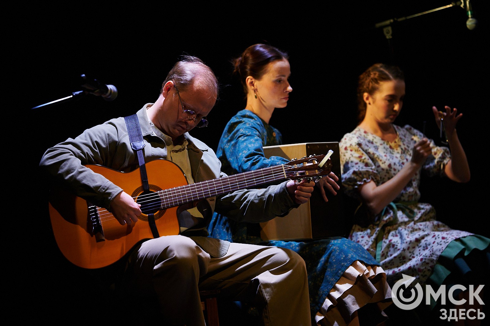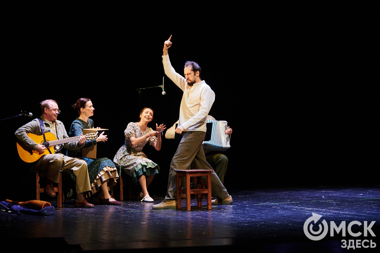 Да и сами музыканты на заднем плане точно подтрунивают над героями спектакля, подзвучивая все комичные моменты. Музыка становится трикстером, издевающимся над персонажами Шукшина и в то же время красноречиво говорящим об их истинных чувствах.