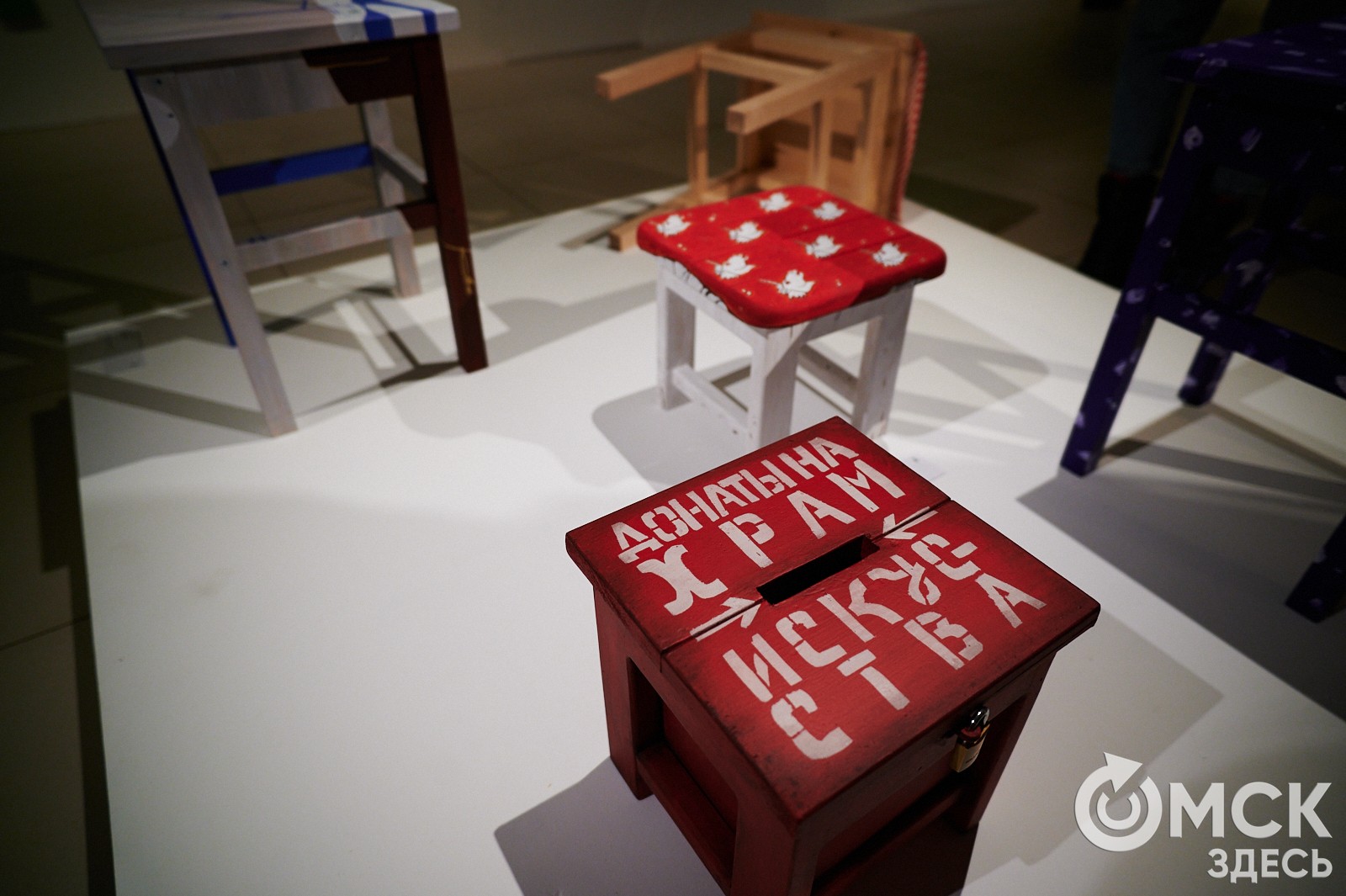Его работа "Донаты на храм искусства" (исполненная на практике) вошла в композицию табуретов. Компанию составили "Волшебный табурет" Андрея Крюкова, "Мелодия снегопада" Николая Молодцова, "Стул для бани" (18+) Сергея Сочивко, "Милый друг" Сохви Ясюкович.