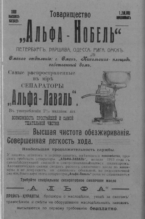 - У наших агентов и перепродавцов, имеющихся повсеместно, просим требовать сепараторы модели 1913 года с самодействующей смазкой и самоустанавливающимся цилиндром. Прейскуранты, брошюры о маслоделии, уходе за скотом, травосеянии и сметы на оборудование высылаются по первому требованию бесплатно, - отмечалось в рекламе, размещённой в справочнике-указателе "Весь Омск".