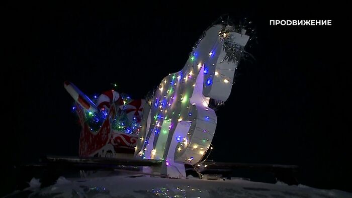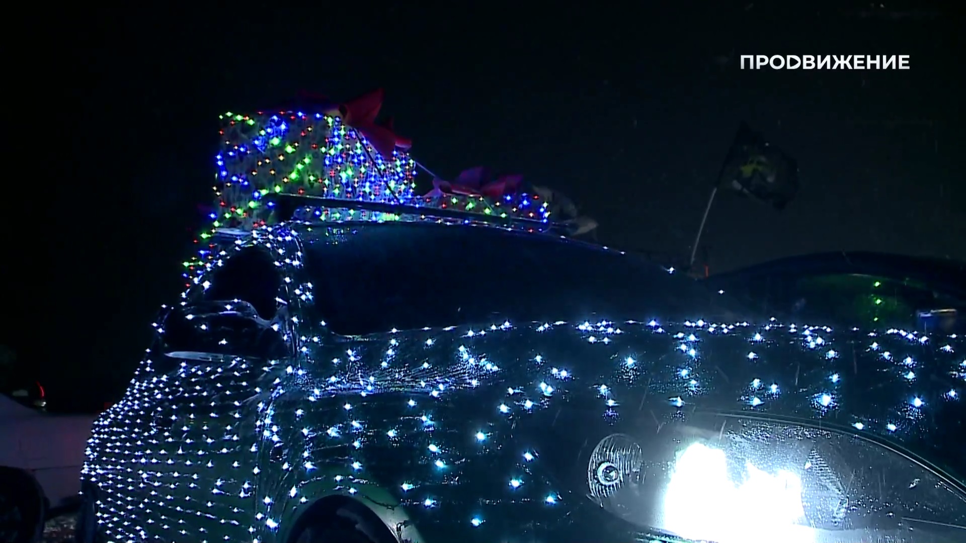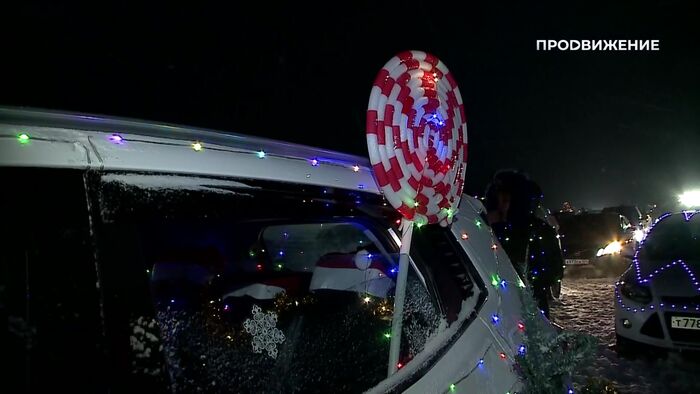 В эти выходные владельцы внедорожников, отечественного автопрома и ретромобилей собрались на традиционный флешмоб. Знакомые новогодние песни звучали из динамиков, водители и их пассажиры пританцовывали возле наряженных машин. В ход шли и покупные украшения, и самодельные. Строительный уплотнитель и цветной скотч - получился леденец. Картонные коробки - конь.