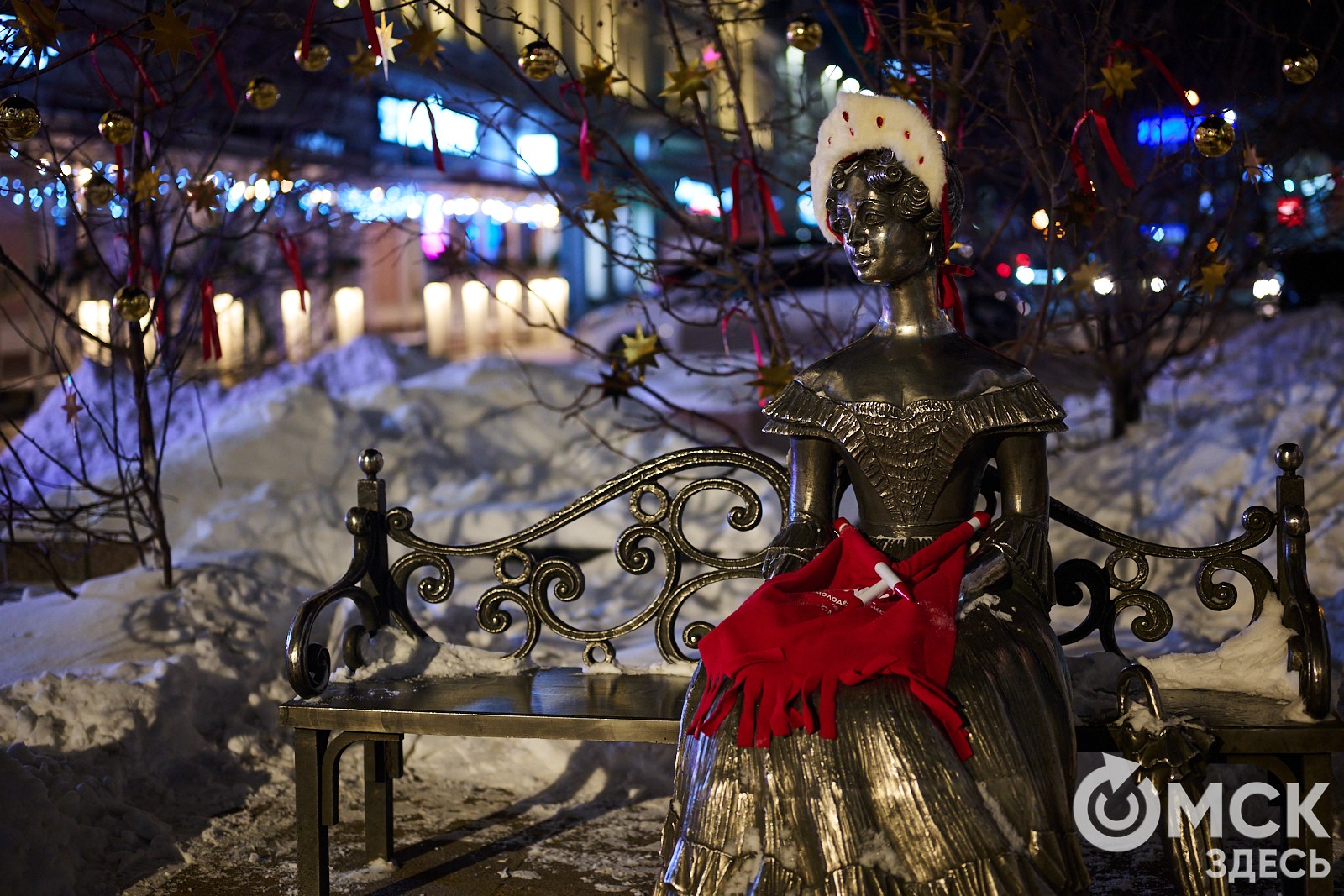 Ул. Партизанская, 14 - 16. На примыкающей ул. Спартаковской в этом сезоне из новогодних украшений только светодиодный фонтан (нововведение 2023 года). Светяющуюся сферу с бантом разместили на площади у Дома дружбы на ул. 5-й Рабочей, 44.