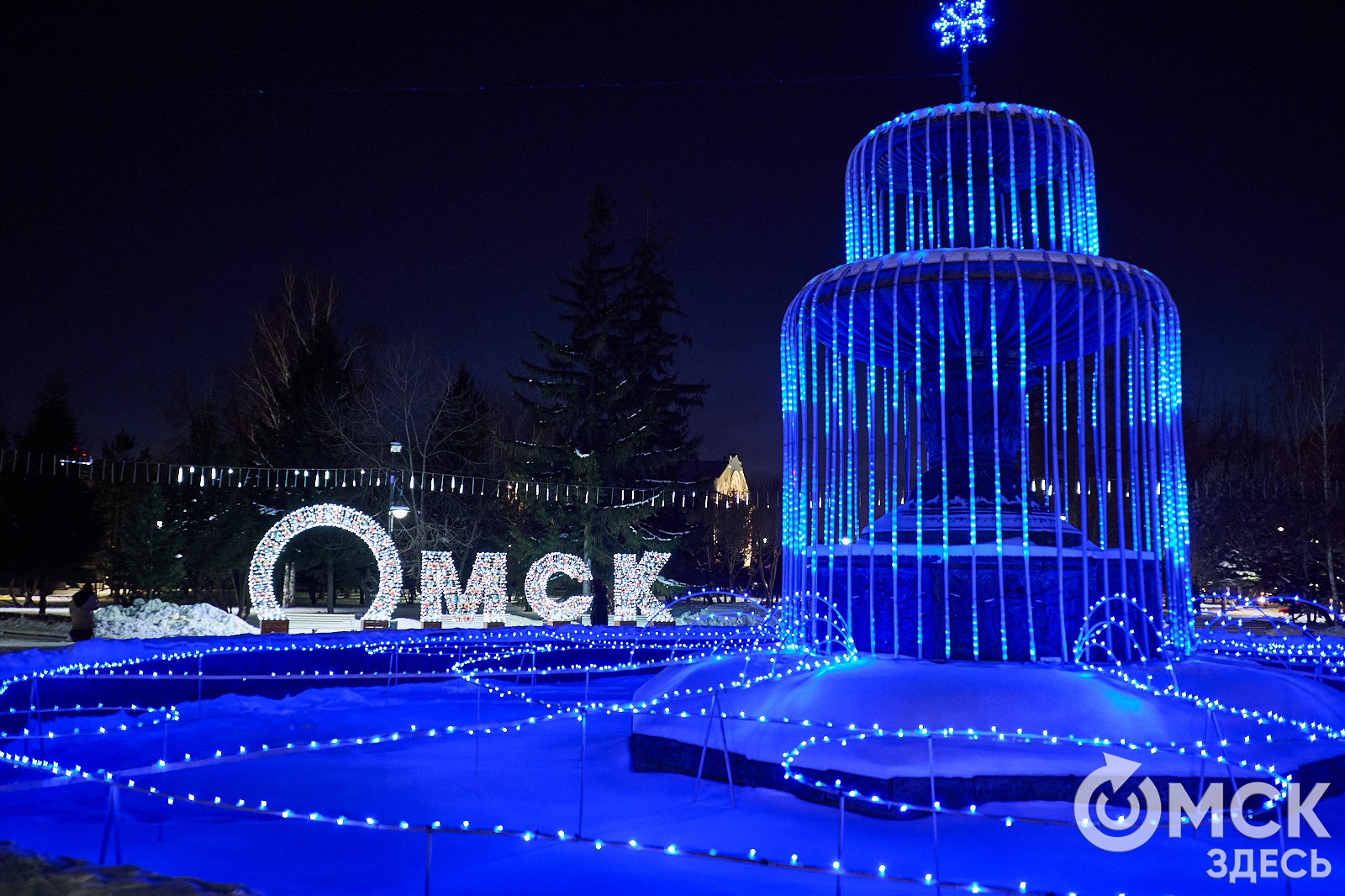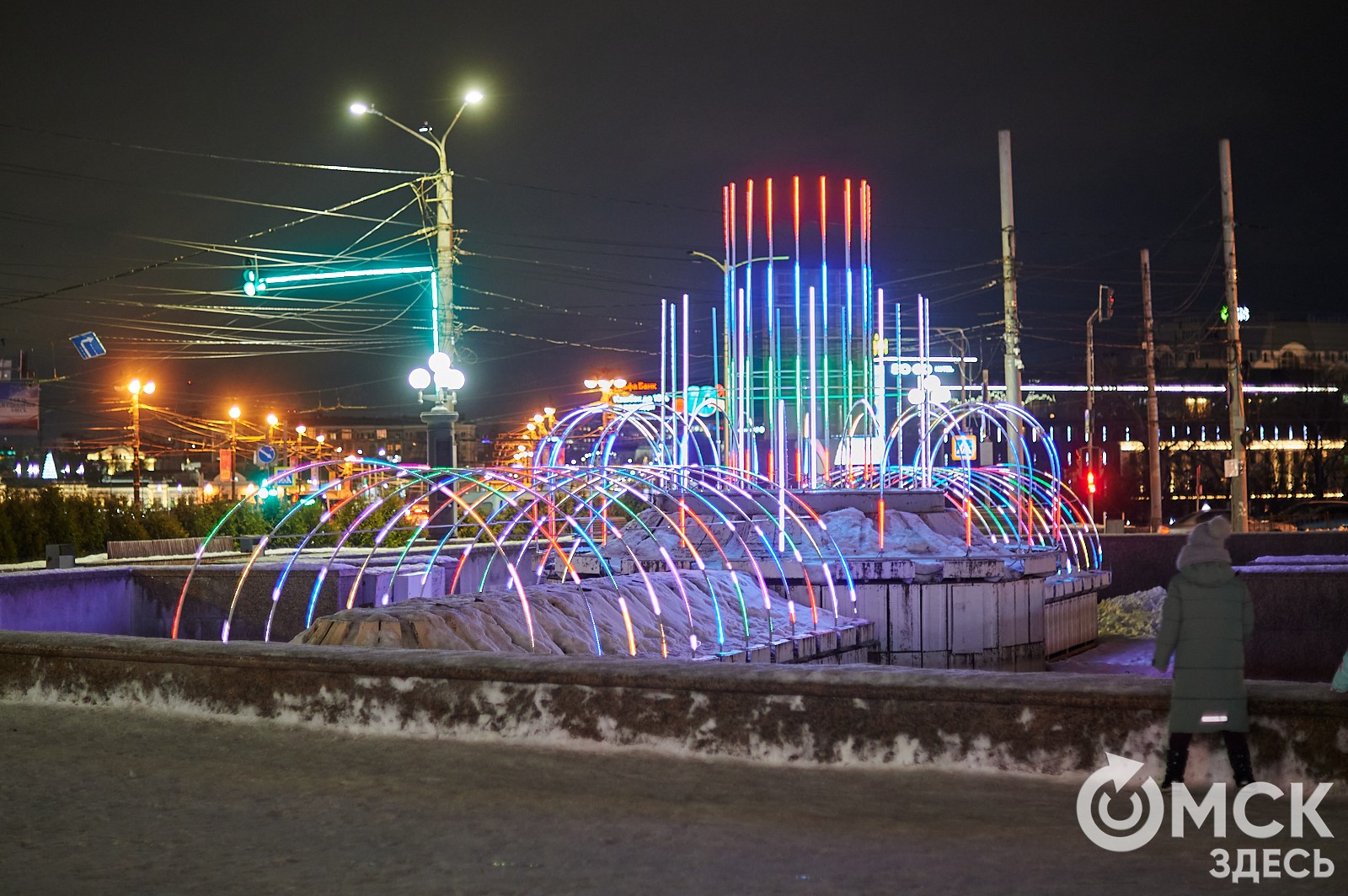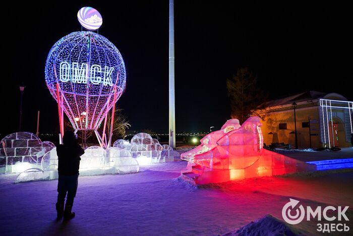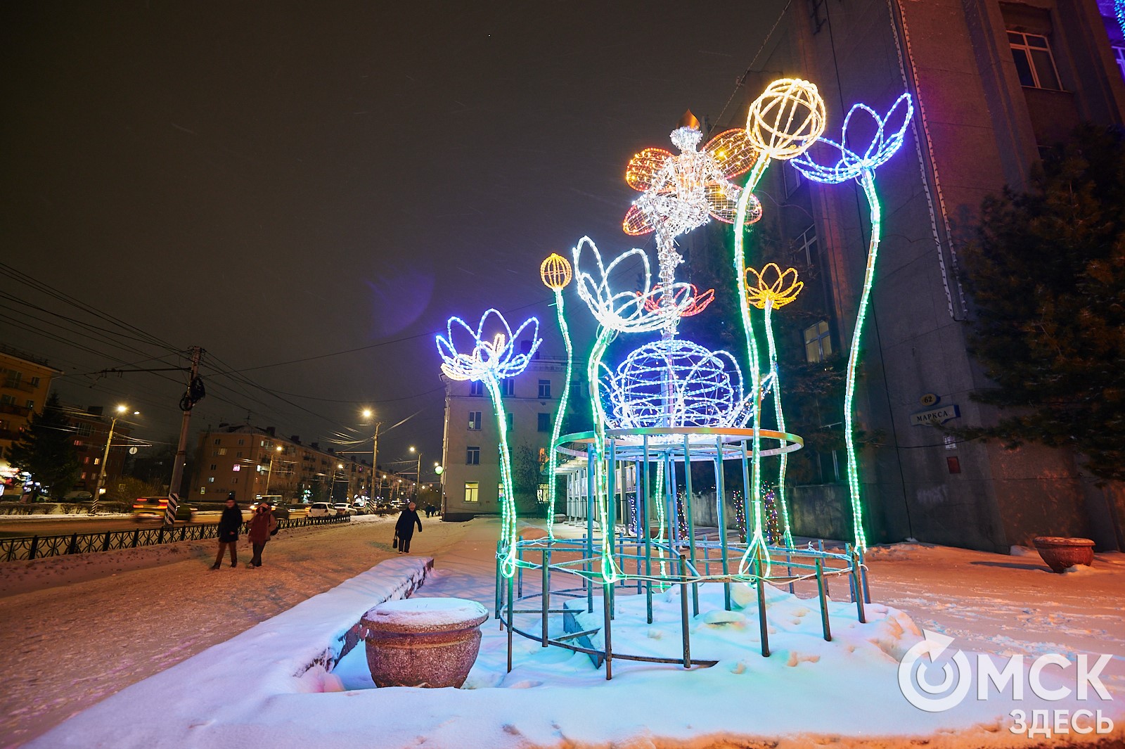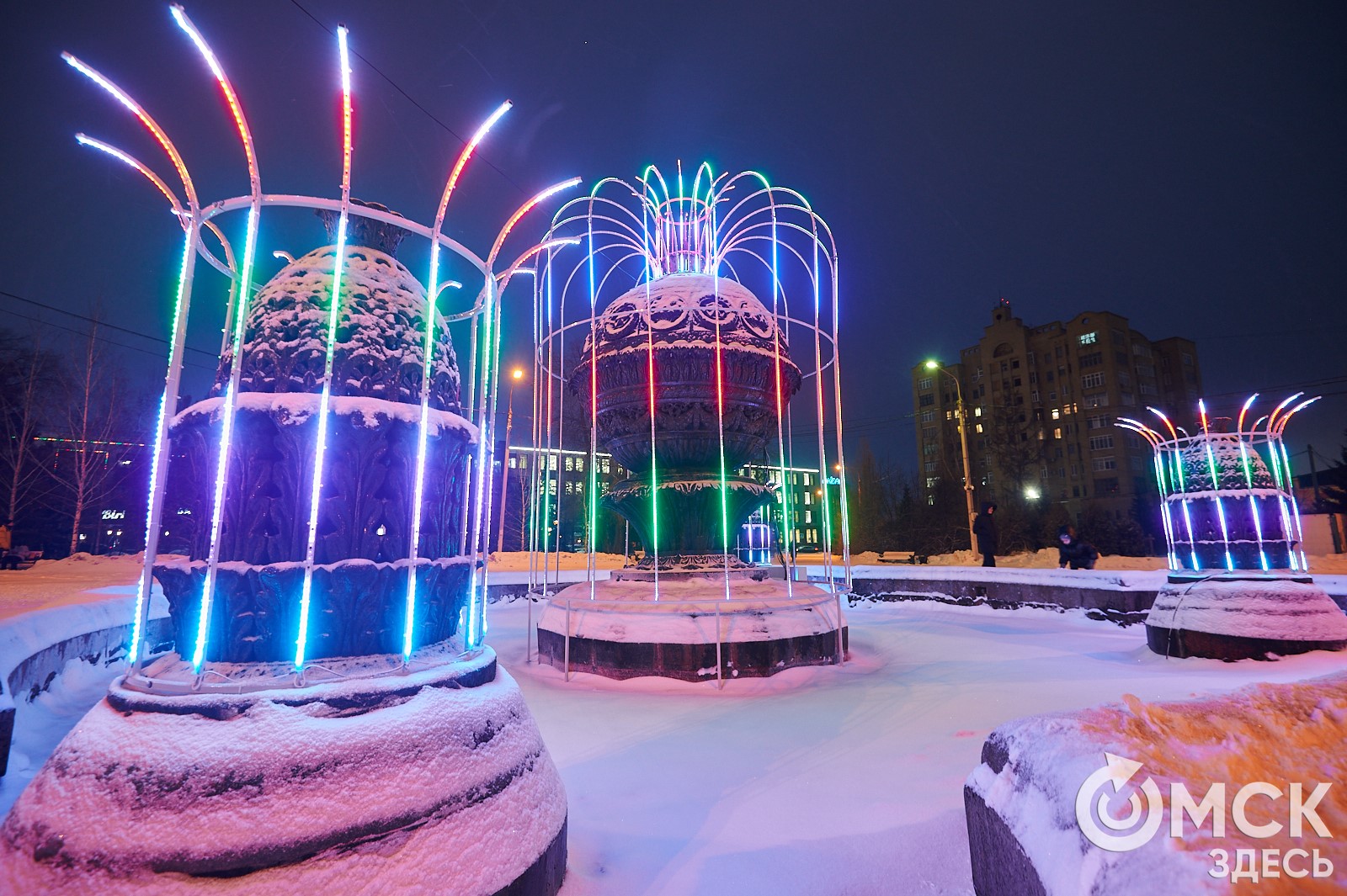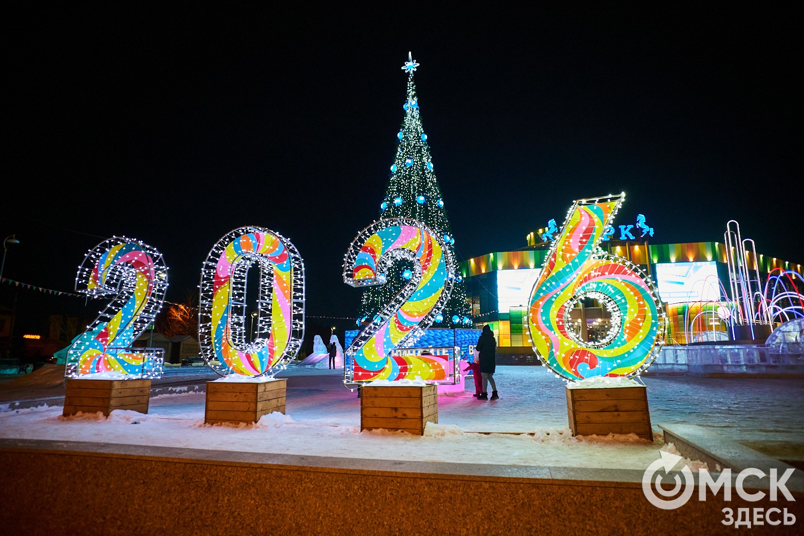Пр. Карла Маркса, 41а и 43б. Да, последнюю цифру инсталляции "2026" ежегодно "дозаказывают" (сравнить можно здесь и здесь), и да, периодически конструкции мигрируют по городским площадкам. Надпись переехала сюда из Омской крепости "в обмен" на воздушный шар. Через дорогу есть ещё один светодиодный фонтан.
