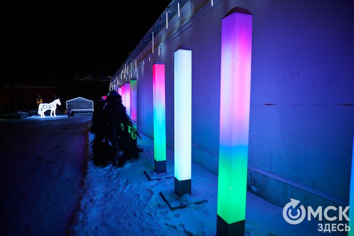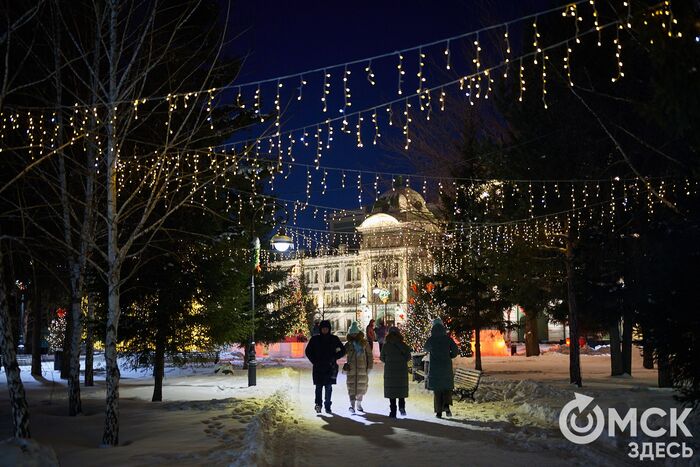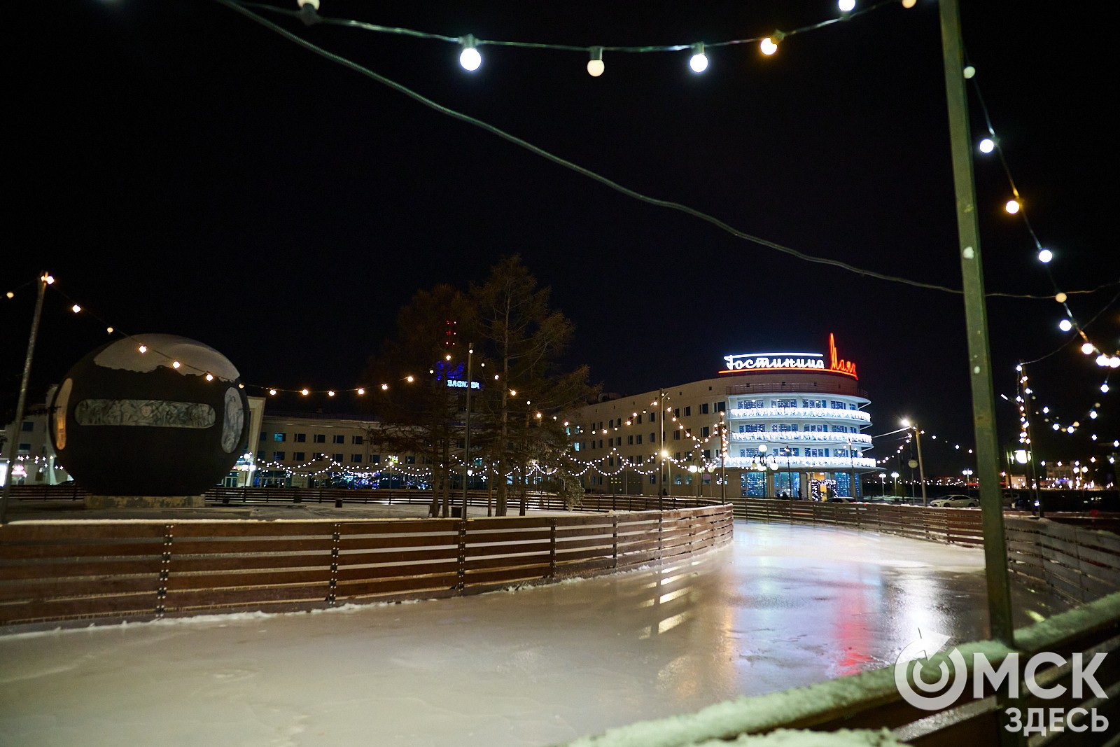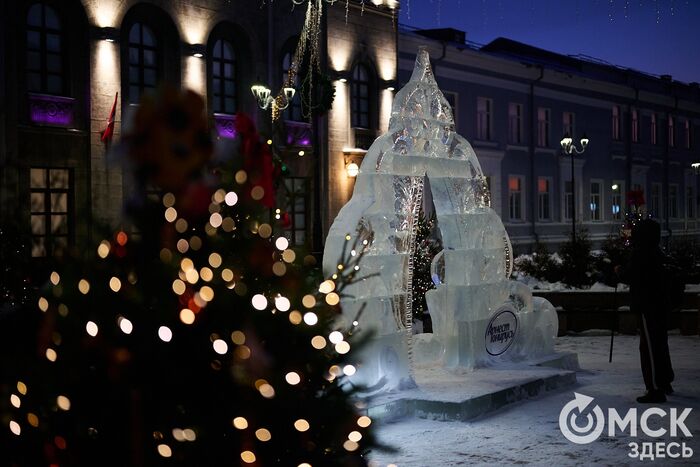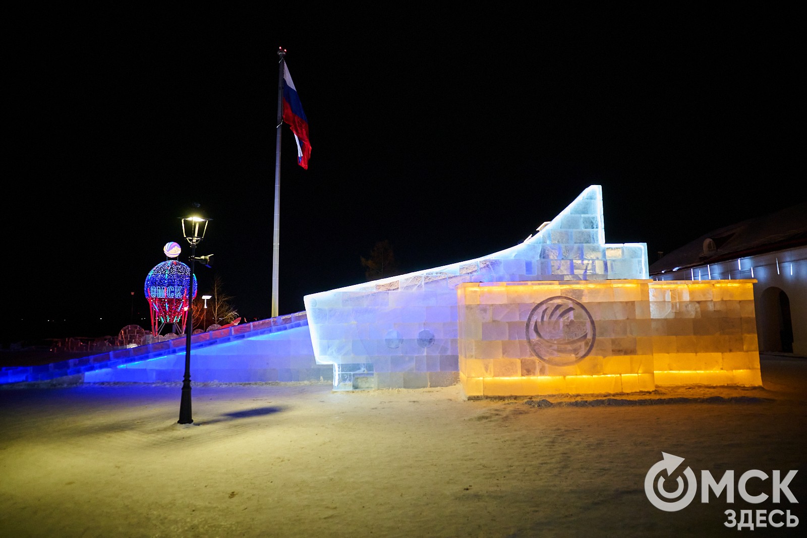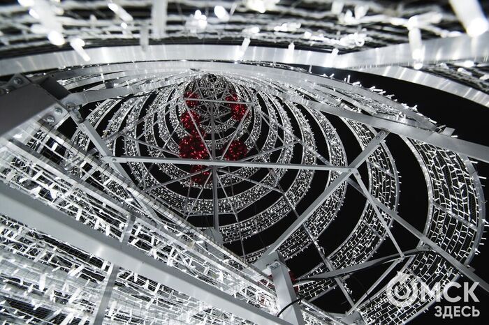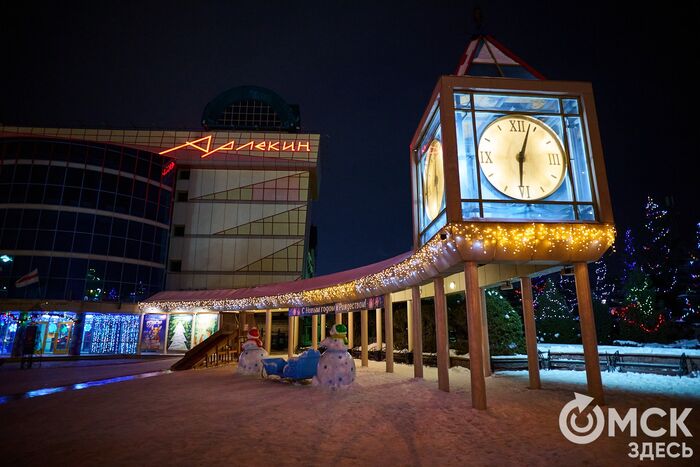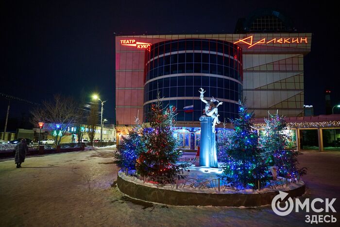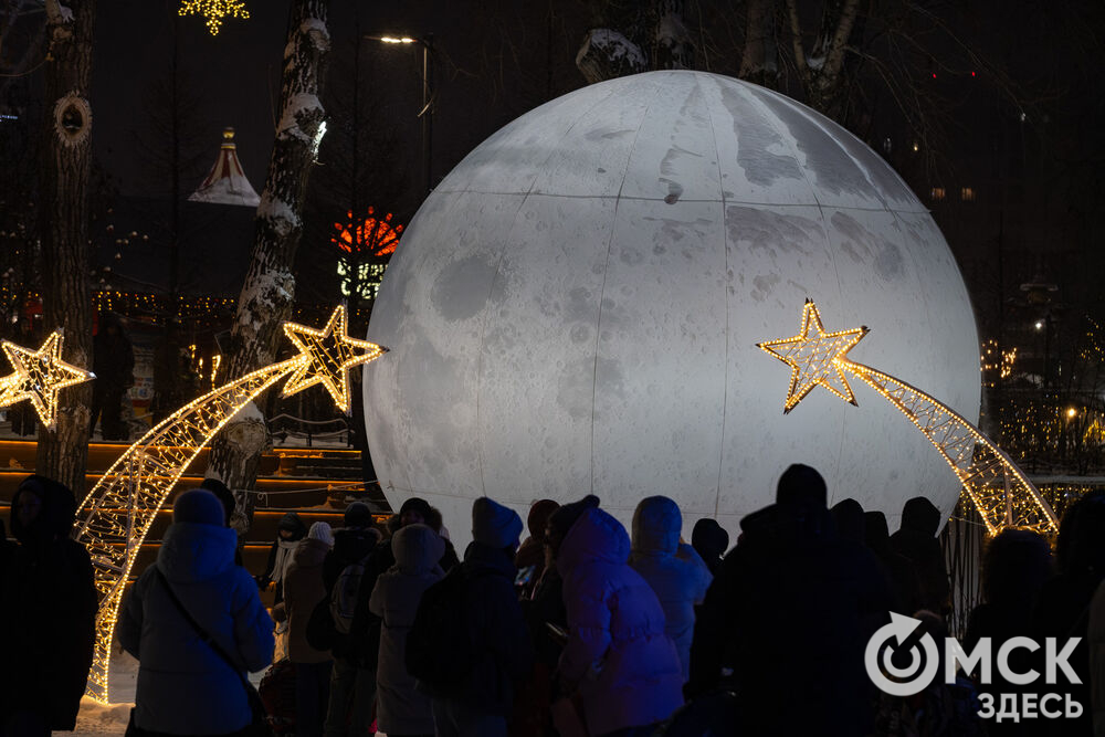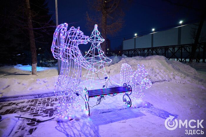 Пр. Карла Маркса, 41а и 43б. Да, последнюю цифру инсталляции "2026" ежегодно "дозаказывают" (сравнить можно здесь и здесь), и да, периодически конструкции мигрируют по городским площадкам. Надпись переехала сюда из Омской крепости "в обмен" на воздушный шар. Через дорогу есть ещё один светодиодный фонтан.