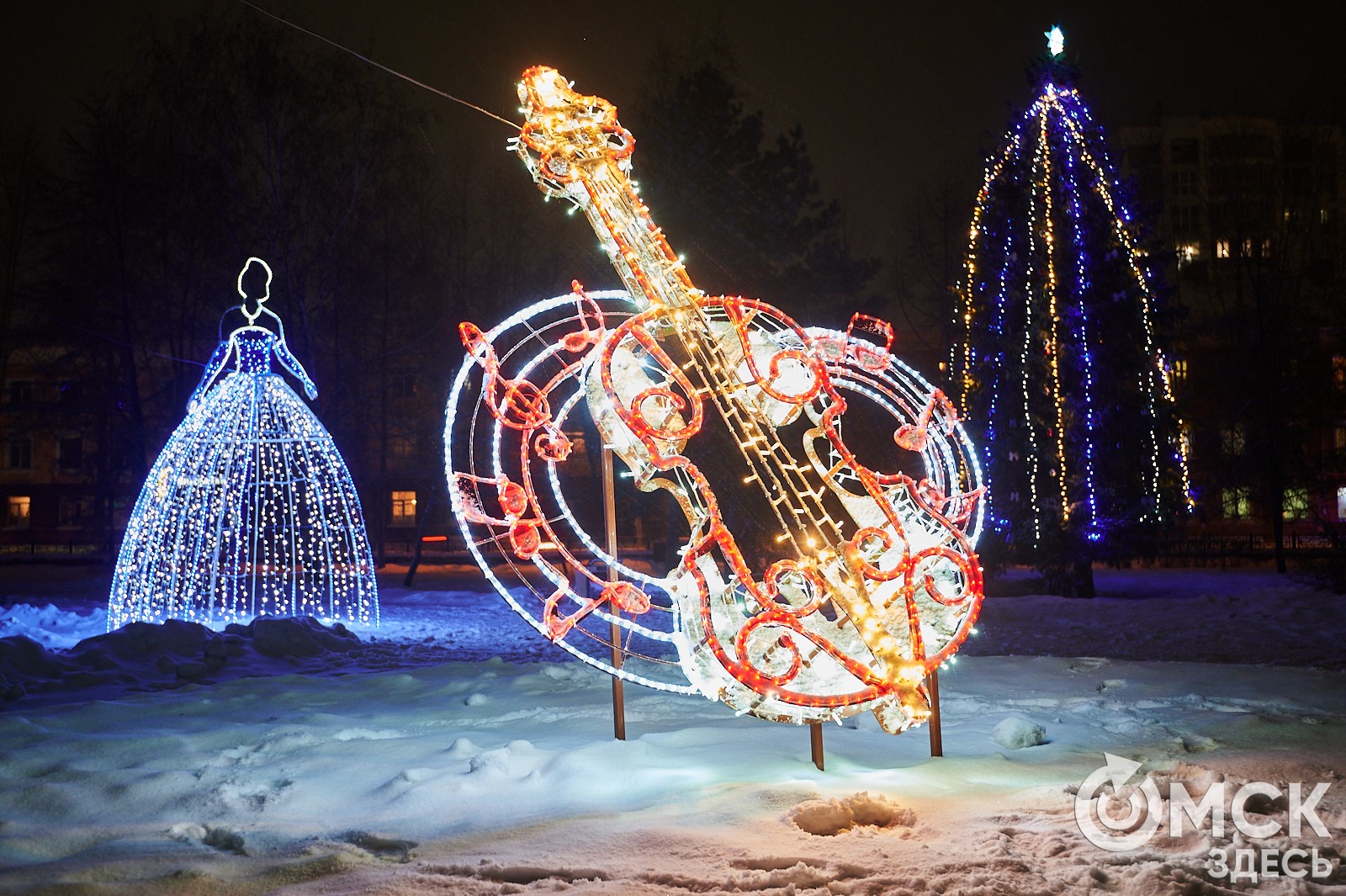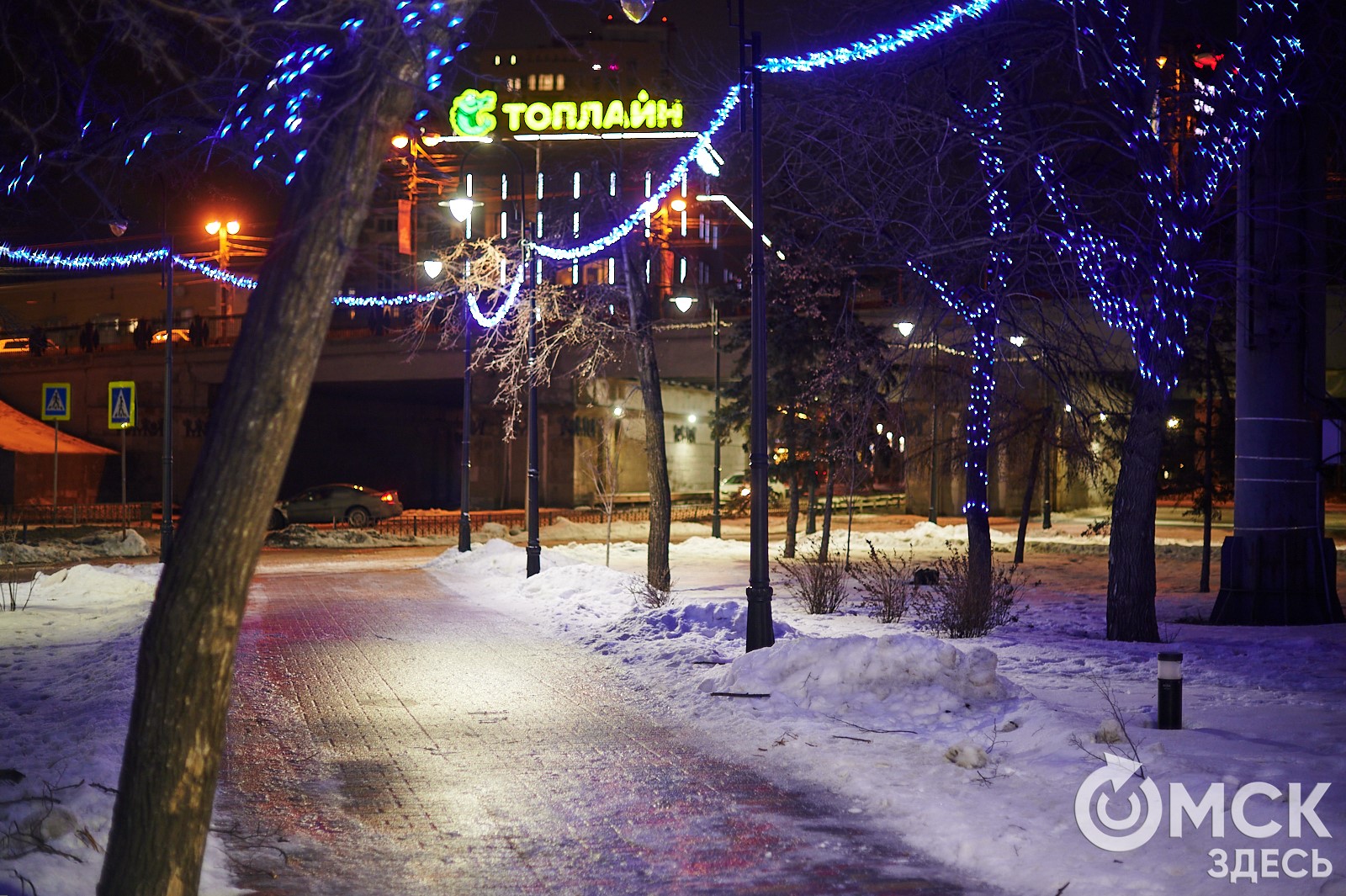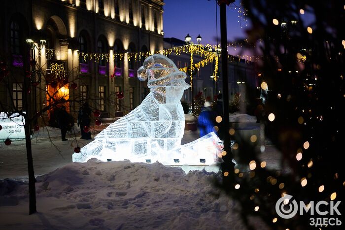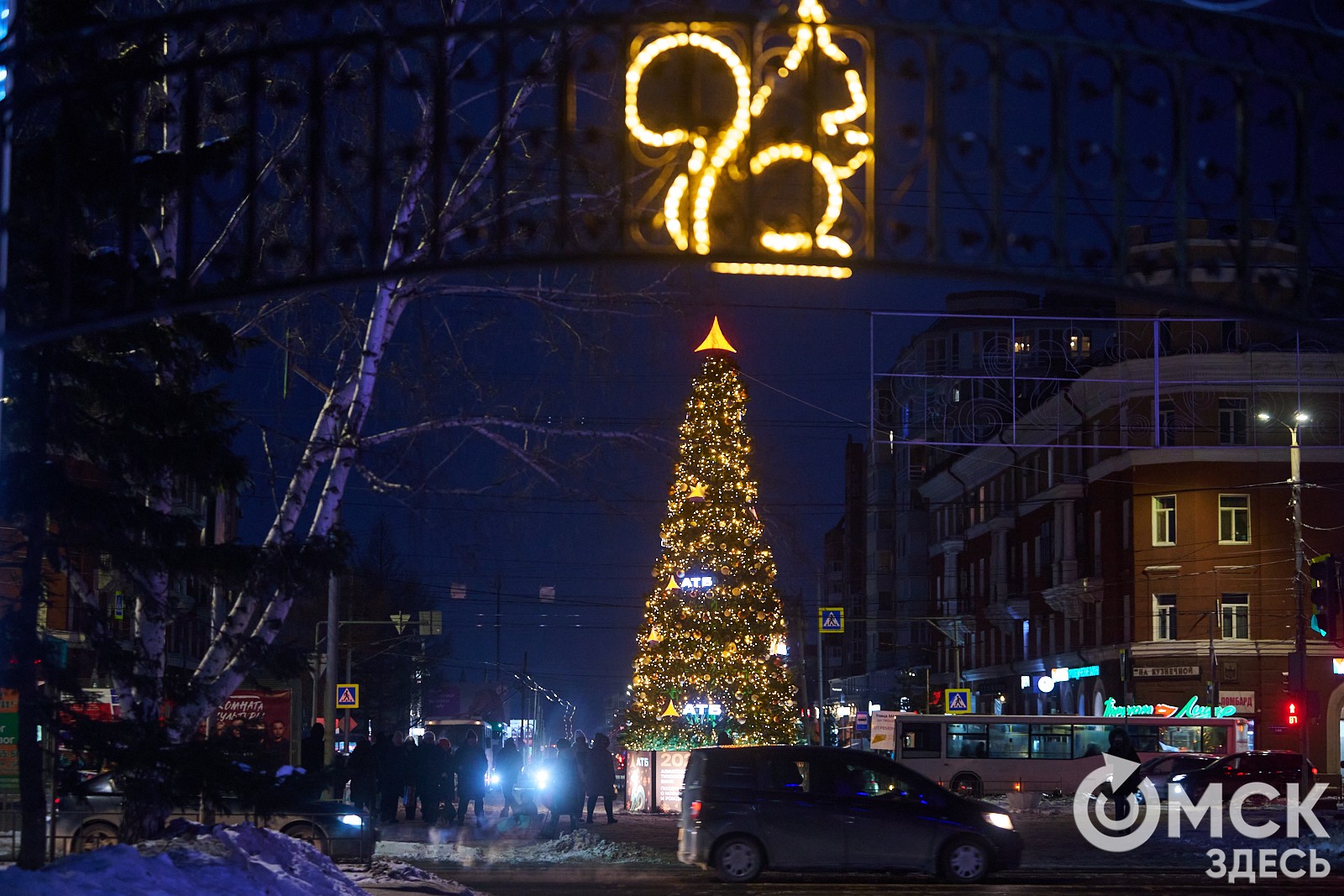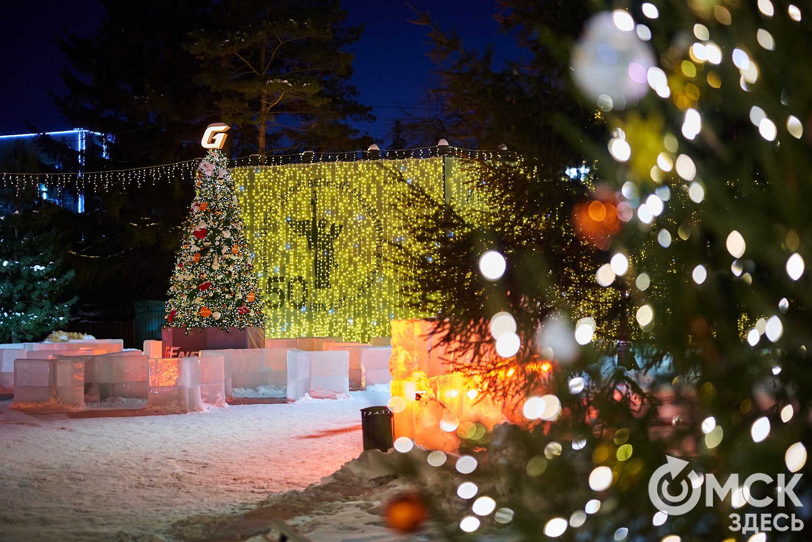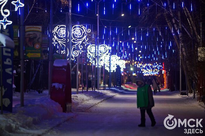 Пр. Карла Маркса, 41а и 43б. Да, последнюю цифру инсталляции "2026" ежегодно "дозаказывают" (сравнить можно здесь и здесь), и да, периодически конструкции мигрируют по городским площадкам. Надпись переехала сюда из Омской крепости "в обмен" на воздушный шар. Через дорогу есть ещё один светодиодный фонтан.