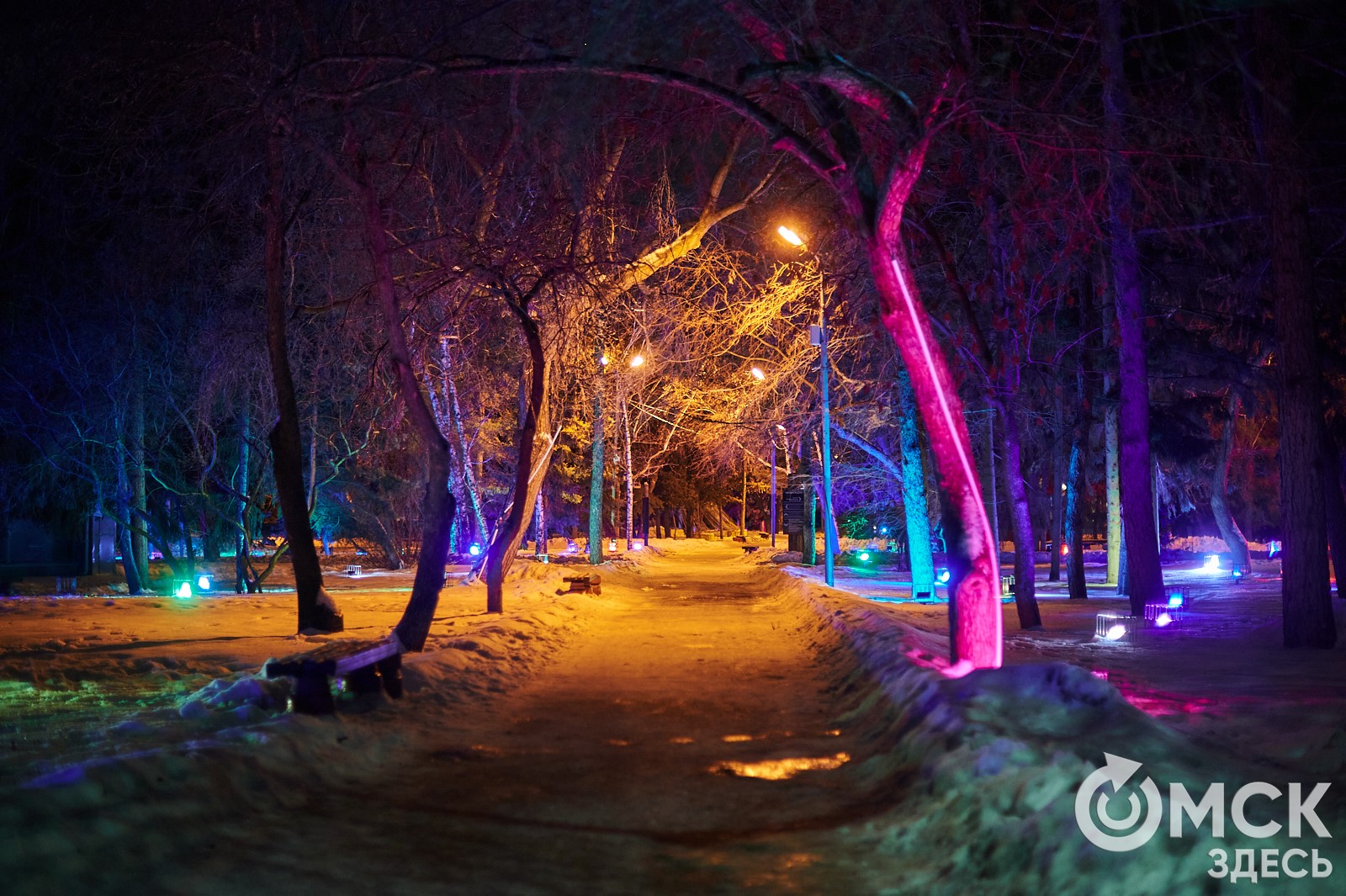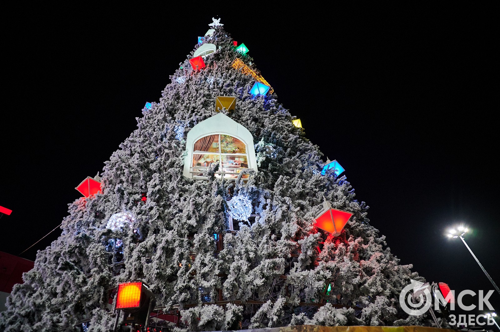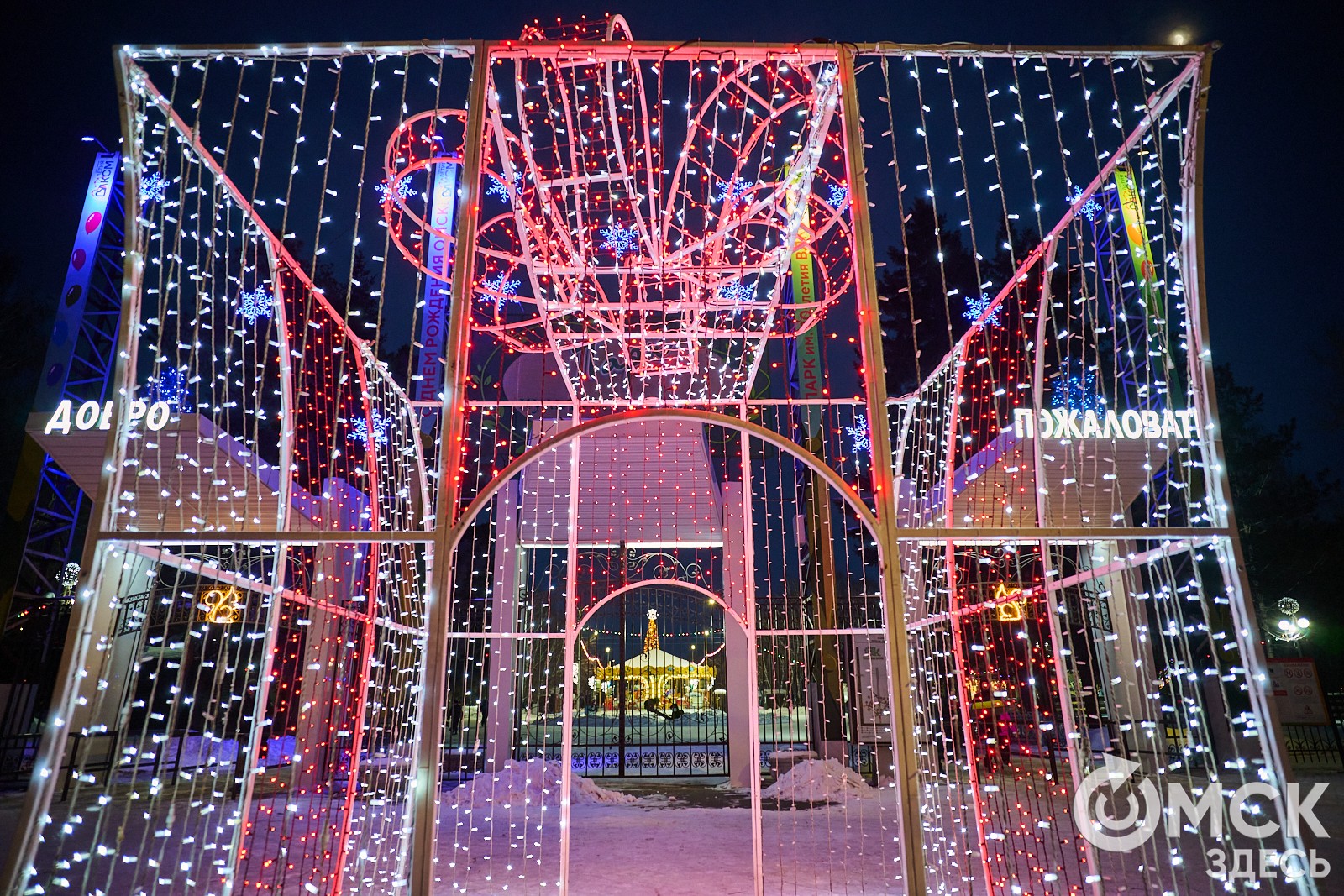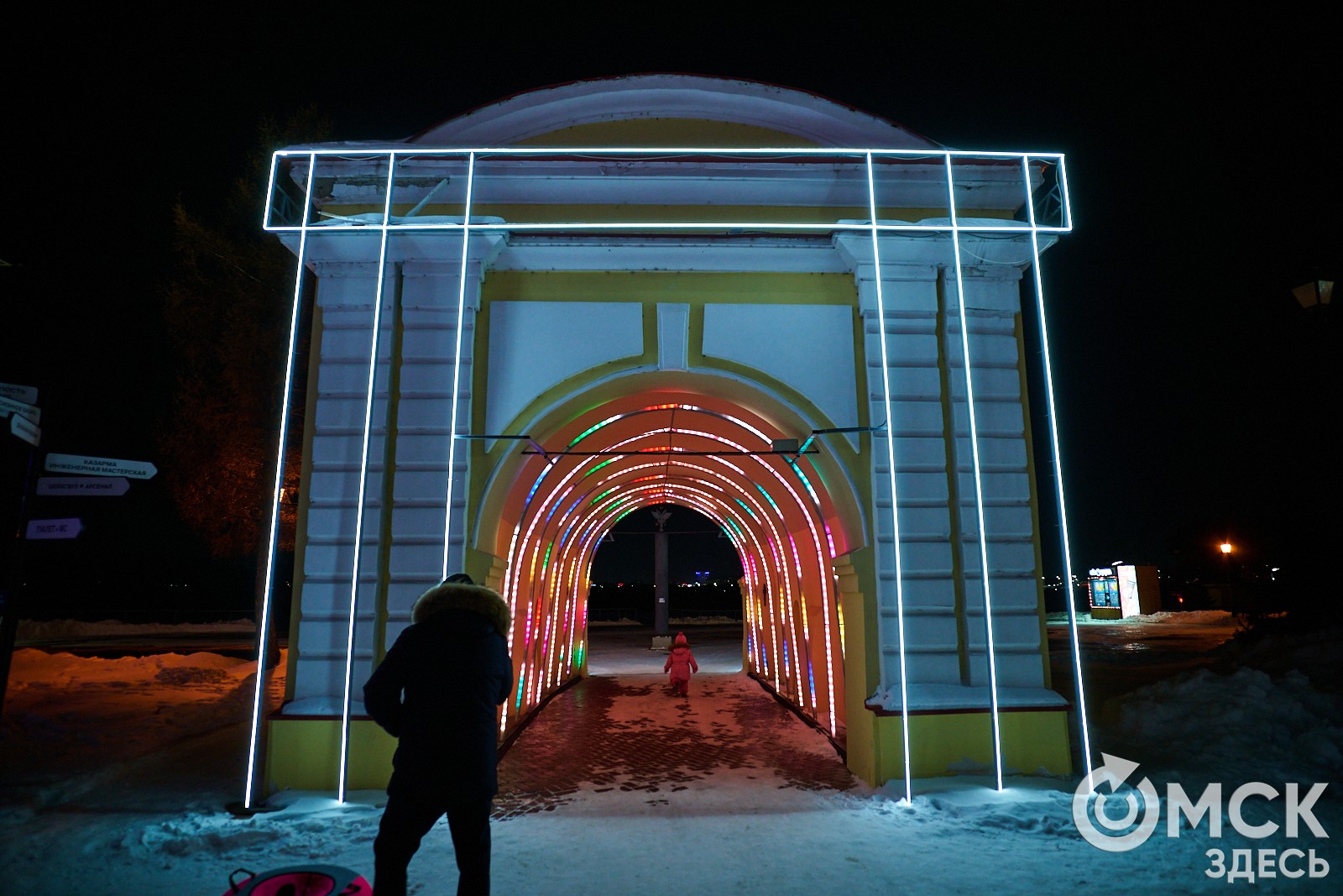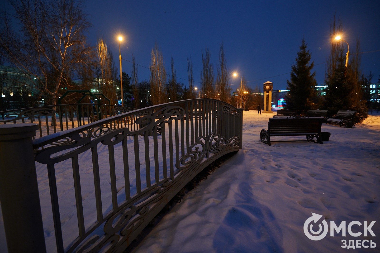 Пр. Карла Маркса, 41а и 43б. Да, последнюю цифру инсталляции "2026" ежегодно "дозаказывают" (сравнить можно здесь и здесь), и да, периодически конструкции мигрируют по городским площадкам. Надпись переехала сюда из Омской крепости "в обмен" на воздушный шар. Через дорогу есть ещё один светодиодный фонтан.