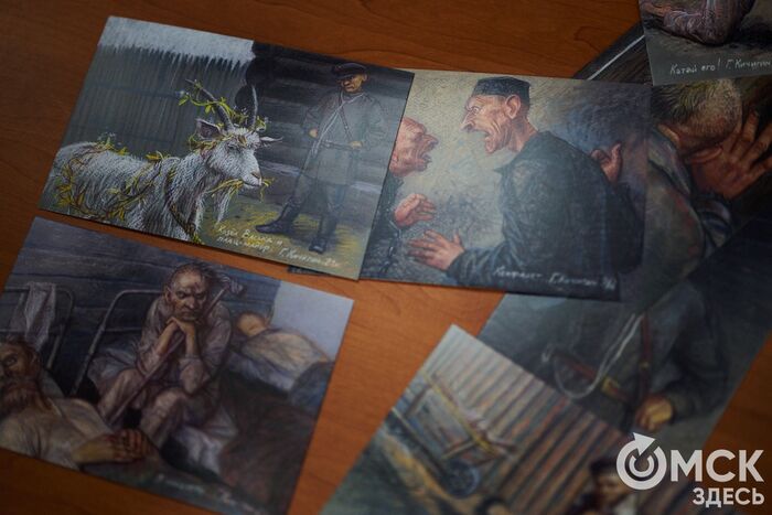 Не стоит забывать о том, что совсем недавно музей презентовал набор открыток "Георгий Кичигин. Серия работ по мотивам повести Ф. М. Достоевского "Записки из Мёртвого дома". В них объединились и масляная живопись, и сепия с углём (чёрно-белая картинка), и пастель.