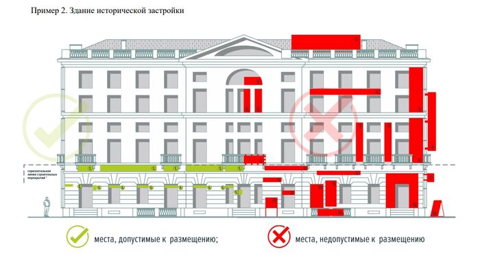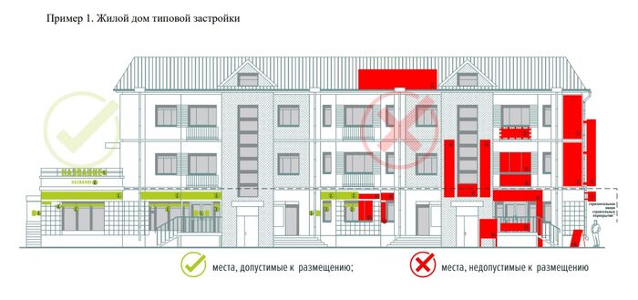 - Размер фасадной вывески составляет по высоте 300 мм, а по длине не должен выходить за границы части фасада, соответствующей занимаемым юридическими лицами или индивидуальными предпринимателями помещениям, - говорится в документе.
