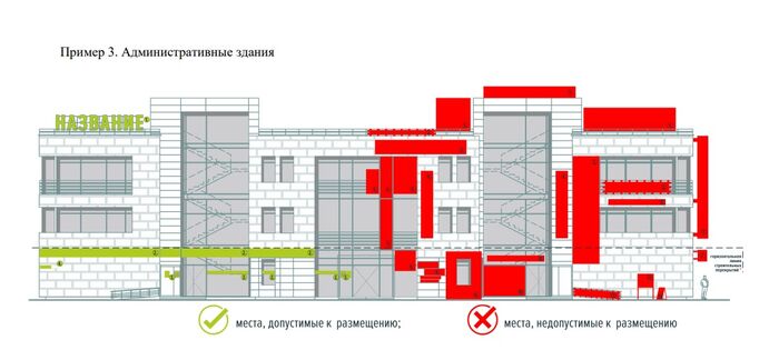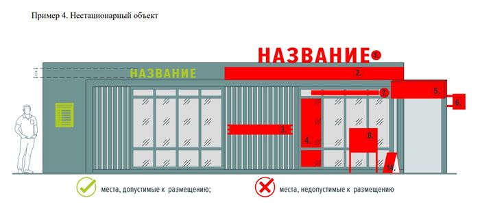 - Внутренняя и наружная часть остекления оконных и витринных проёмов должна быть свободна от любых надписей, рисунков, декоративных элементов и т.п. Не допускается полное или частичное перекрытие внутренней или наружной части оконных и витринных проёмов объекта, - отмечено разработчиками. Исключение: если вывеску невозможно разместить по линии перекрытий. Но тогда надпись должны быть белого цвета в виде отдельно расположенных букв, а не сплошь, и занимать не более 1/3 окна. - Не допускается выполнение фасадной вывески непосредственно на остеклении окна или витрины с использованием бумажных и баннерных материалов.