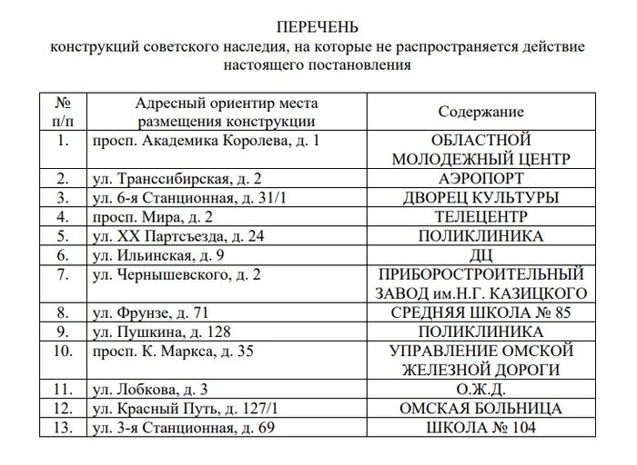 В исключения из требований попали конструкции советской эпохи, хотя и не все (ранее, напомним, похожий перечень создали с помощью откликнувшихся омичей в сообществе "Делай город").