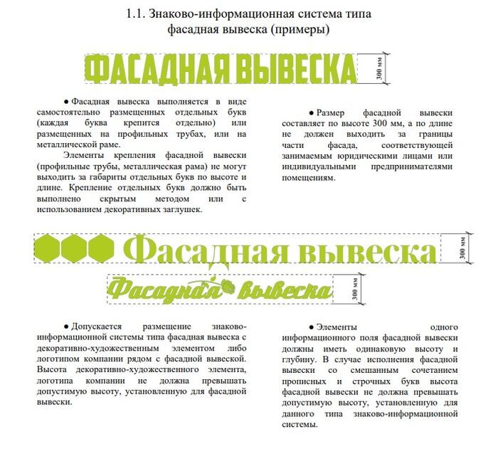 Так, в проекте этого года прописано, что фасадная вывеска выполняется в виде плоскостных или объемных самостоятельно размещенных отдельных букв. То есть каждая буква крепится отдельно. Возможно размещение букв на профильных трубах или на металлической раме, с декоративно-художественным элементом либо логотипом, который устанавливается с левой стороны от букв.