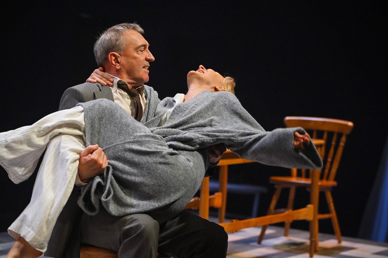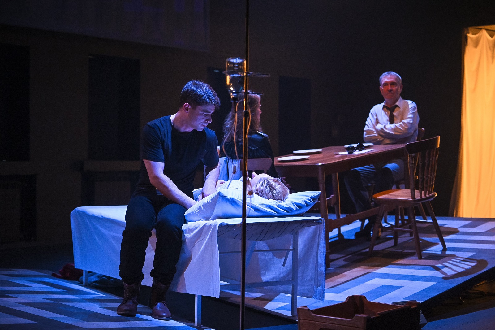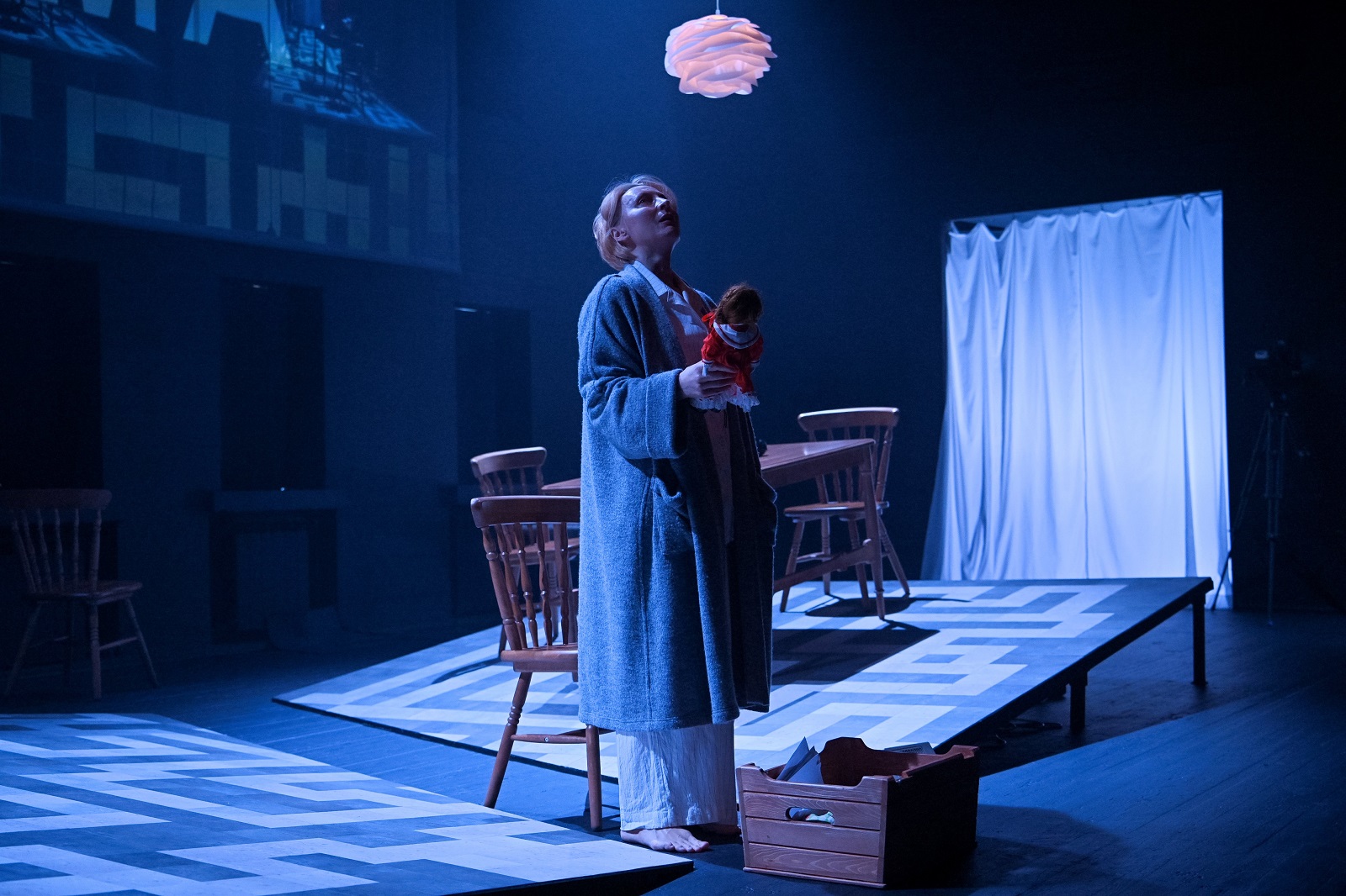 Художник-постановщик Анастасия Разенкова создала из бытового пространства психологически наглядную картину. Пол кухни - места, где домохозяйка проводит много времени, расколот на две части. И две половинки комнаты накренились, как и вся мебель, точно всё сущее затягивает героев в чёрную дыру. Затягивает, да всё никак не затянет, потому что не Анна первая и не Анна последняя сталкивается с такой проблемой.