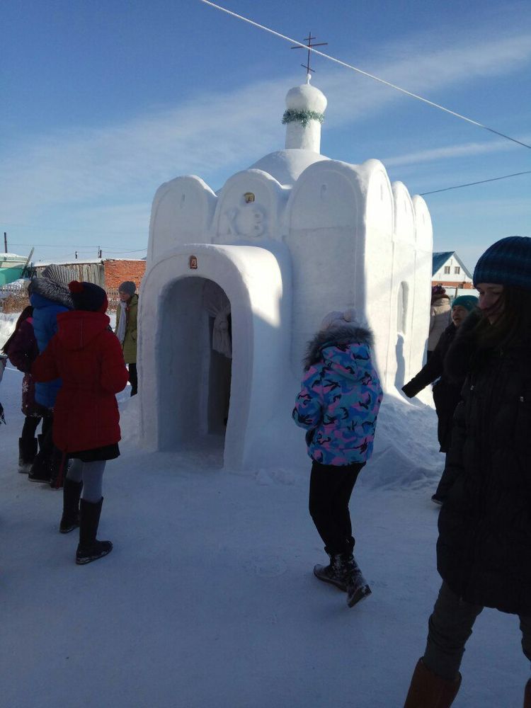 Пользователь соцсети "ВКонтакте" Олег Малышков поделился фотографиями необычного сооружения, построенного в селе Сосновка Азовского района Омской области. Сельчанин возвёл во дворе своего дома православную часовню из снега. Внутри неё установлены иконы и лампада со свечами.