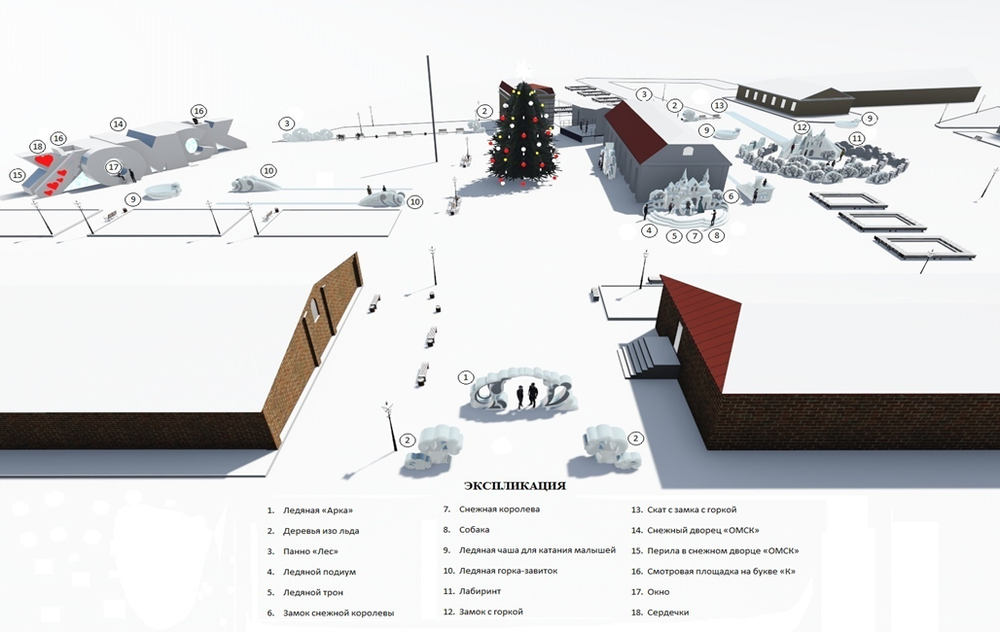 Кроме того, для горожан построят еще замок, совмещенный с горкой, и надпись "Омск" длиной 27 метров и высотой 4,2 метра. Внутри каждой буквы строители должны будут вырубить комнаты с дверями и окнами, наверх будет вести снежная лестница.