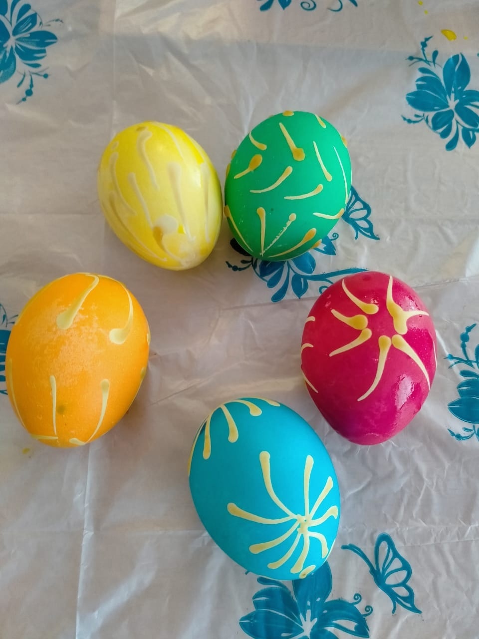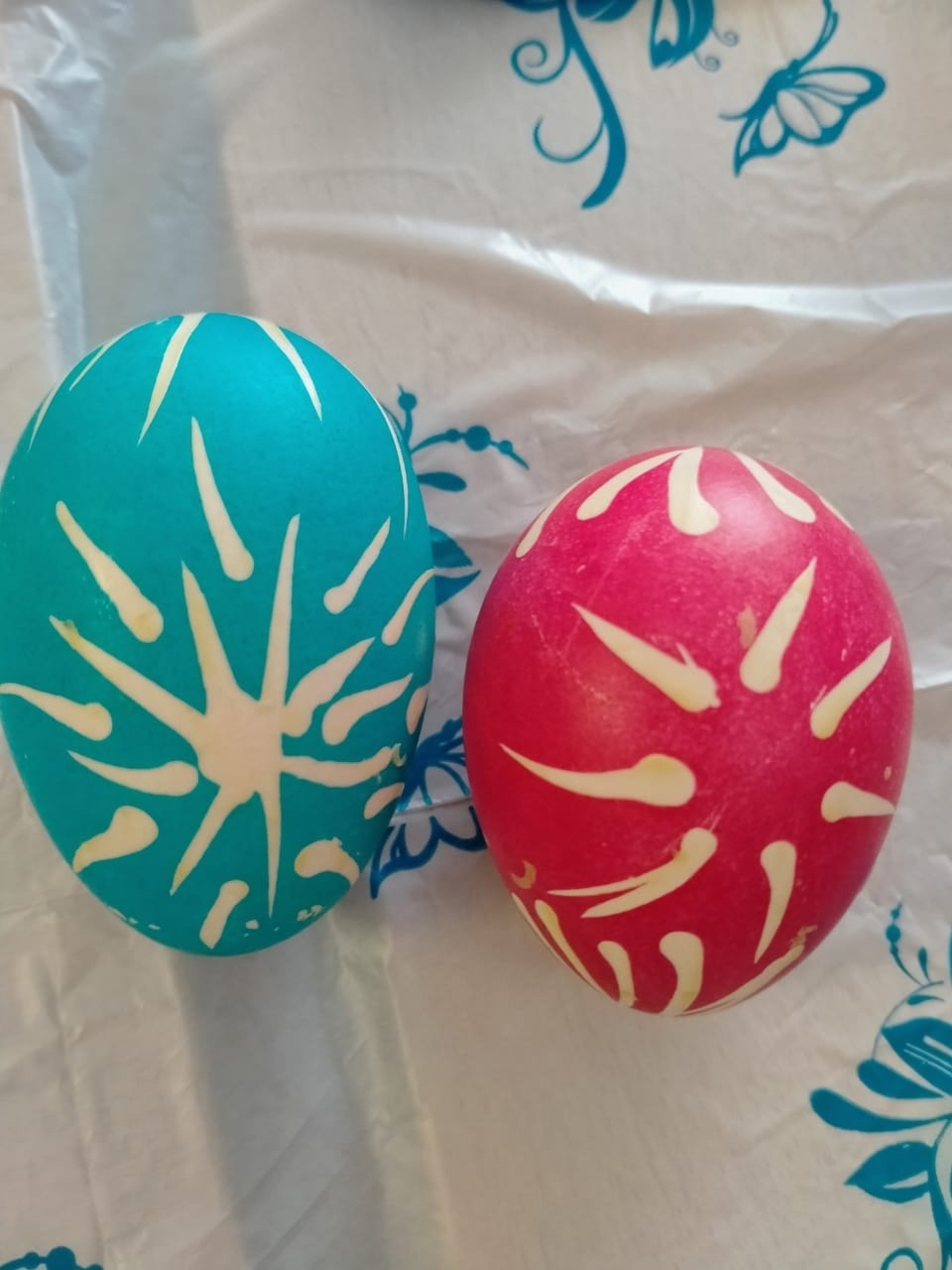 - Узоры использовались природные: листики, веточки, цветочки. Ещё писали "ХВ" - Христос Воскрес. Однако сейчас, приходя на мастер-классы, дети сами иногда придумывают свои узоры. Что касается цветов, то у каждого было своё значение. Свекровь всегда говорила, что лучше брать чисто белое яйцо, чтобы краситель лучше прилипал. А воск она никогда не выкидывала, соскребала в сковородочку и использовала несколько раз.
