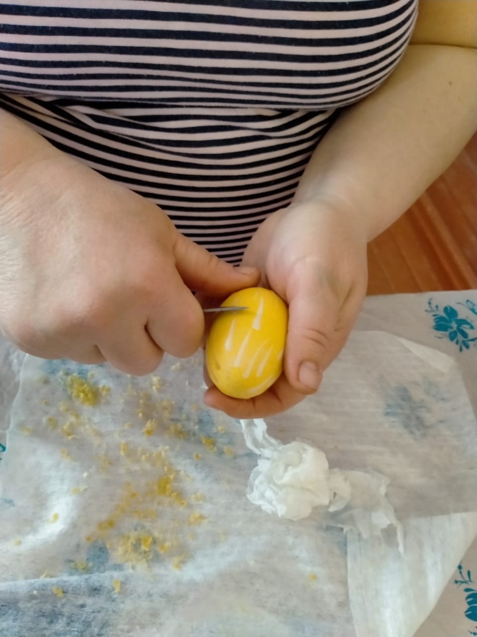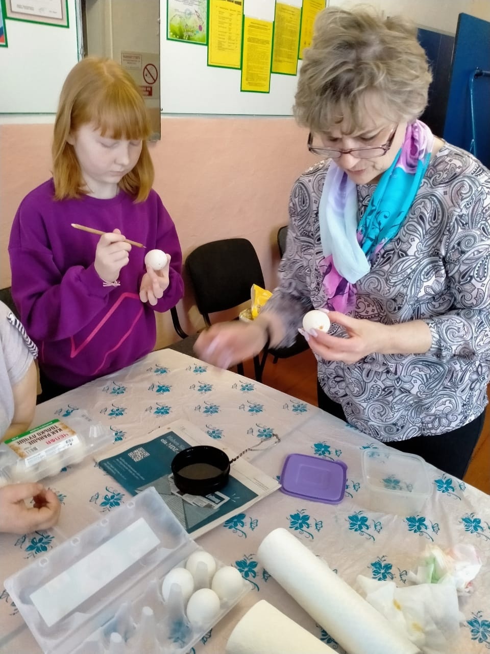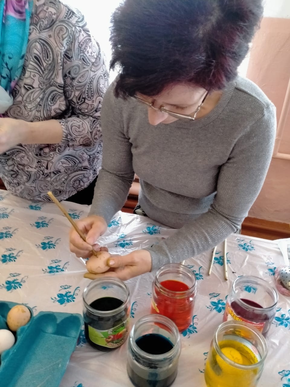 - С традицией раскрашивания яиц воском познакомила мою свекровь ещё её бабушка. Теперь и я продолжаю эту традицию: провожу мастер-классы в нашем клубе. Сначала отваривали яйцо, затем его остужали, оно должно было быть холодными. Рисовали воском, поэтому потом растапливали воск или восковые свечи, но магазинные свечи не подойдут. Затем наносили воск специальными инструментами: палочка, на которую обязательно набивался гвоздик со шляпкой, чтобы рисовать ягодки, веточки. Палочки моей свекрови у нас сохранились, их я использую на мастер-классах. Когда яйцо было разукрашено, его опускали в воду с красителем. После всего воск соскребался, и получались писанки.