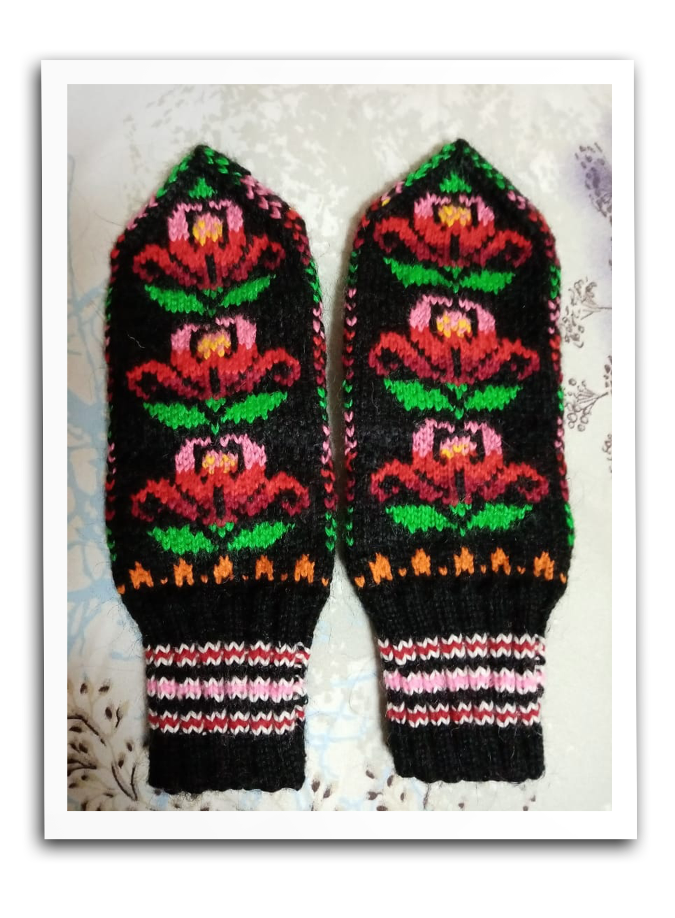 А ещё я занималась реконструкцией: брала старые варежки, допустим, в Оконешниковском районе и восстанавливала их. В прошлом году мне попалась в руки старая тетрадочка. Она принадлежит одной бабушке из деревни Салтыковка в Кормиловском районе. В этой деревне жили латыши, бабушка уже давно умерла, но сын сохранил её тетрадку и принёс к нам в центр. Я брала из неё кое-какие схемы, что-то своё добавляла - и у меня получилось новое латышское направление варежек в моей коллекции: на чёрном фоне - цветы. Деревня, где жили латыши, в пяти километрах от нас, и я помню из детства, как женщины собирались, садились на лошадь и ехали в эту Салтыковку к латышам за варежками.