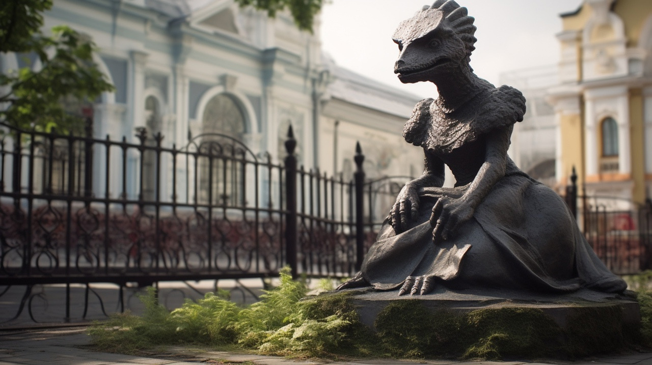 Одну из главных достопримечательностей Омска - скульптуру Любочки - нейросеть Midjourney увидела грустной ящерицей. А мы просто просили посадить динозавра рядом с девушкой, но что-то пошло не так. Интересный был бы фэнтезийный поворот для истории Омска. Писатели из рубрики #встречисавтором, обратите внимание!